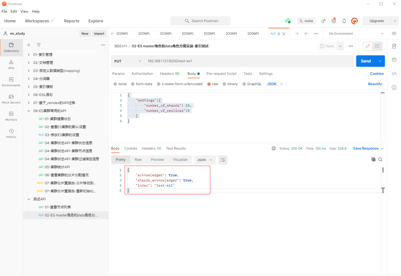 填写PUT请求192.168.1.121:9200/test-es1,创建10分片0副本的索引test-es1