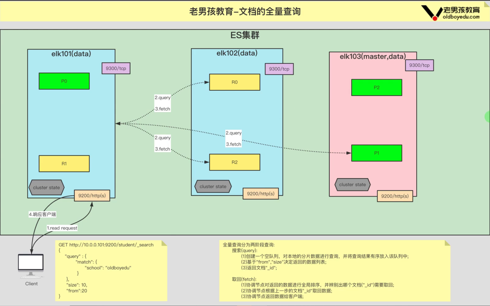 3、主节点协调查询请求,并将查询请求发送到每个包含索引数据的分片。