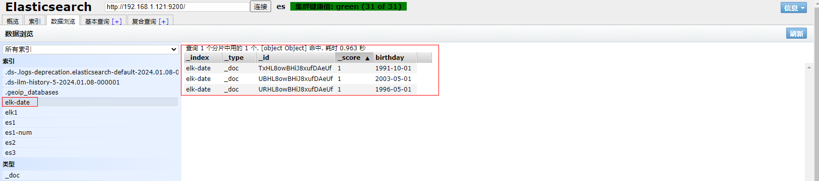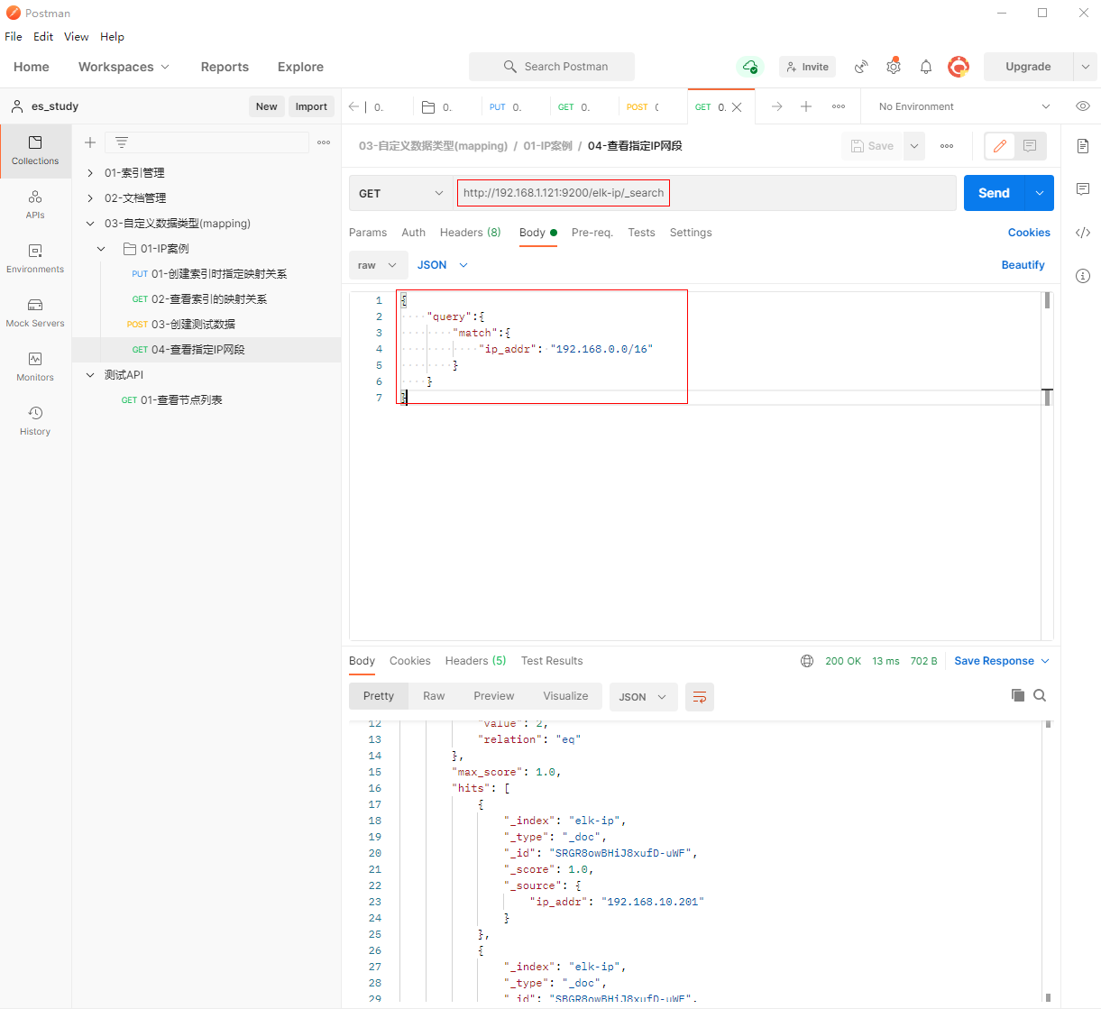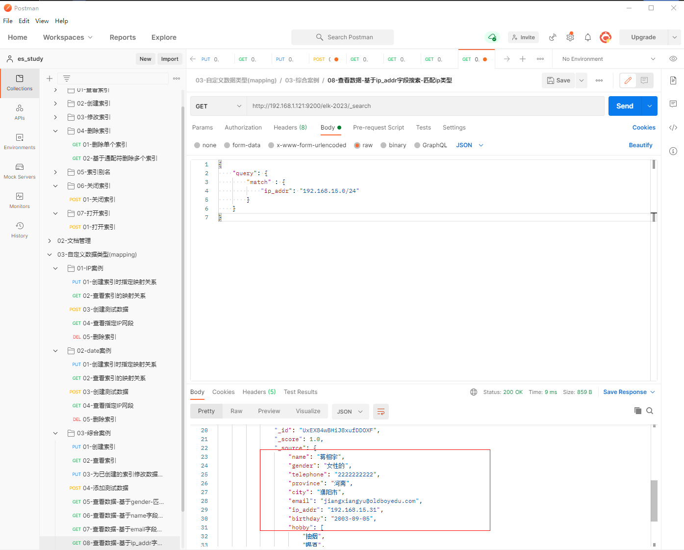 1、填写GET请求http://192.168.1.121:9200/elk-2023/_search, 匹配ip_addr的值为192.168.15.0/24,查看到成功匹配