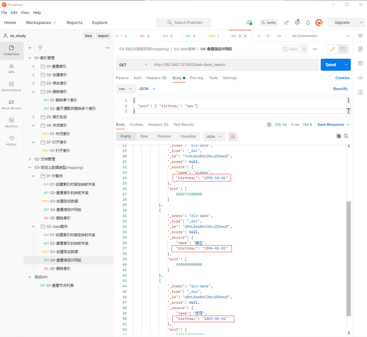 1、填写GET请求http://192.168.1.121:9200/elk-date/_search, 查看年龄,从大到小(注意,比较的是数字,数字大的在下面)