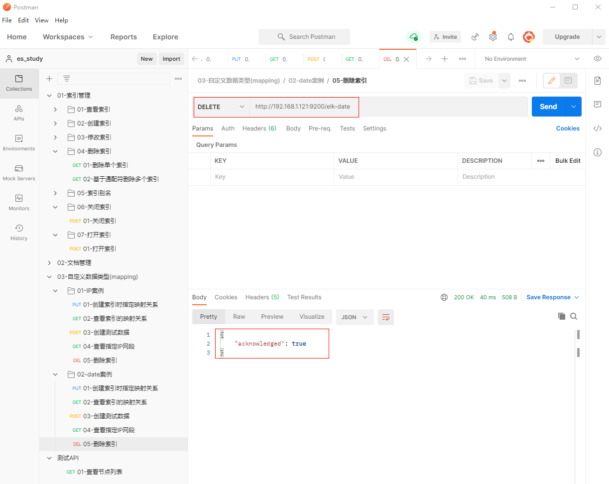 1、填写DELETE请求http://192.168.1.121:9200/elk-date, 删除索引elk-date