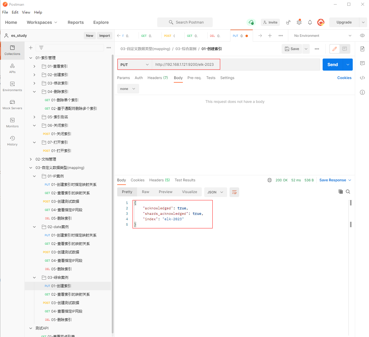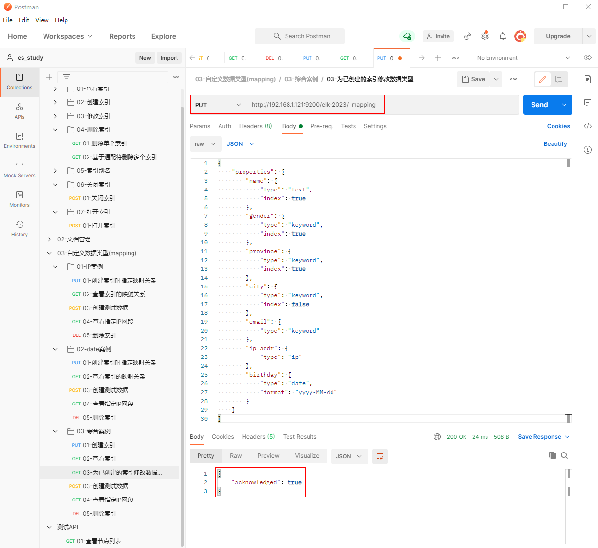 1、填写PUT请求http://192.168.1.121:9200/elk-2023, 创建索引时指定映射关系