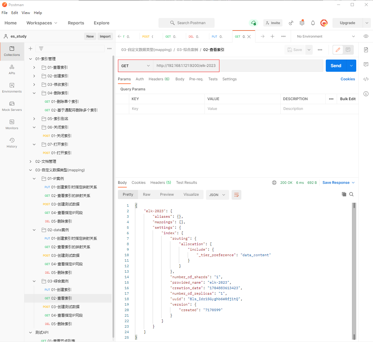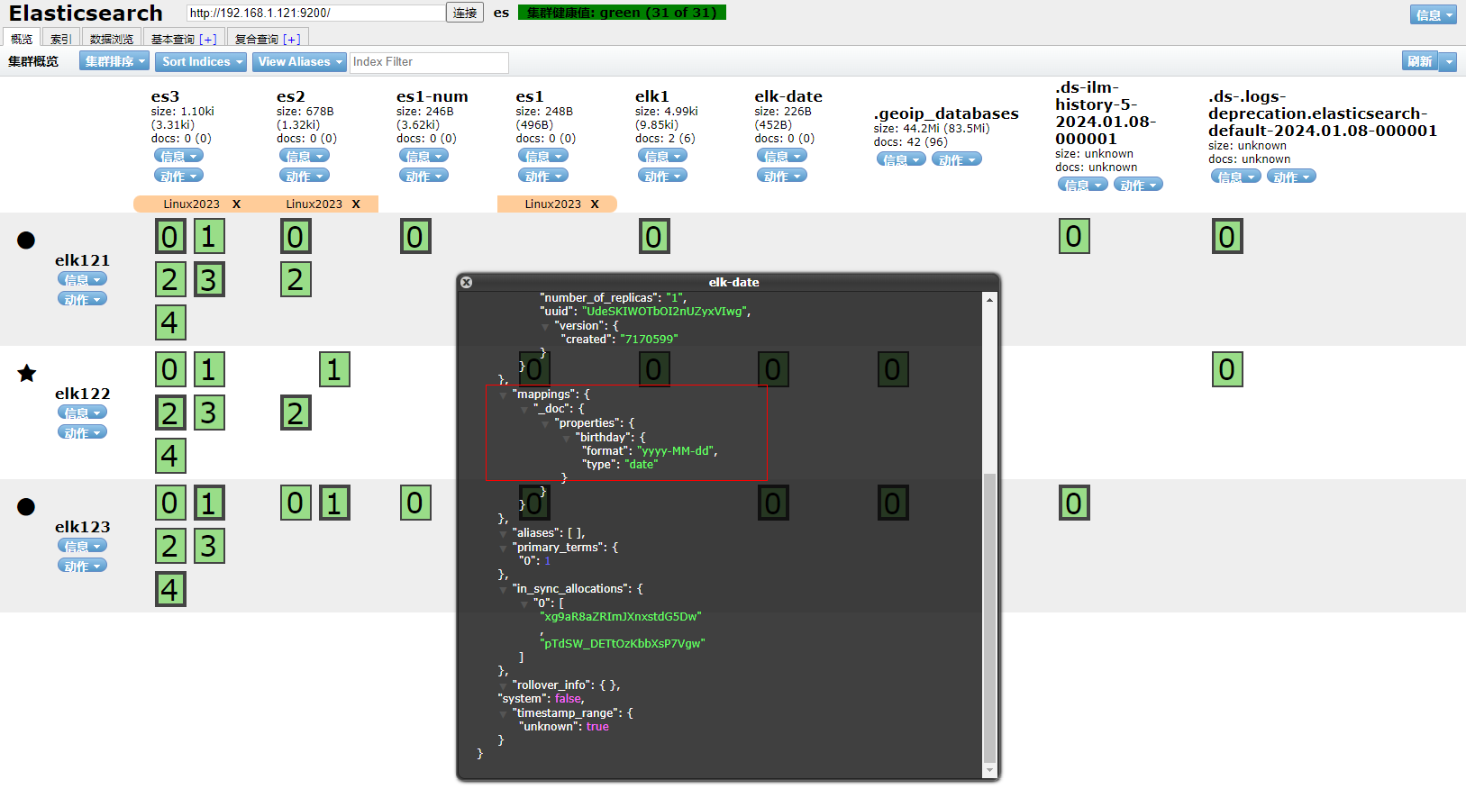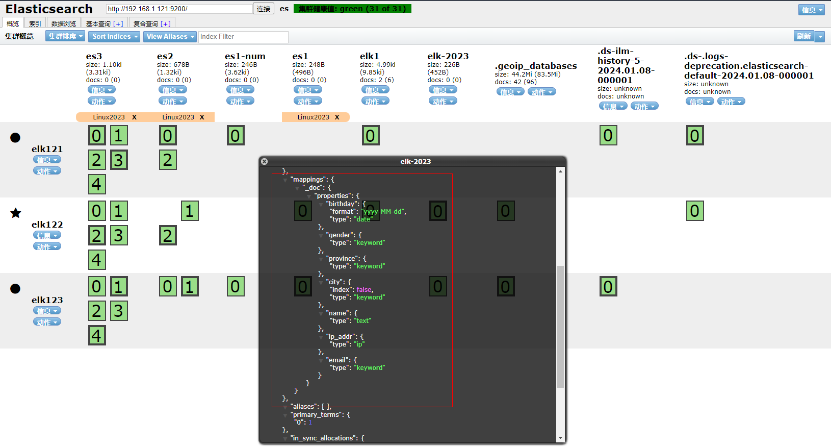 1、填写GET请求http://192.168.1.121:9200/elk-2023, 查看索引的映射关系