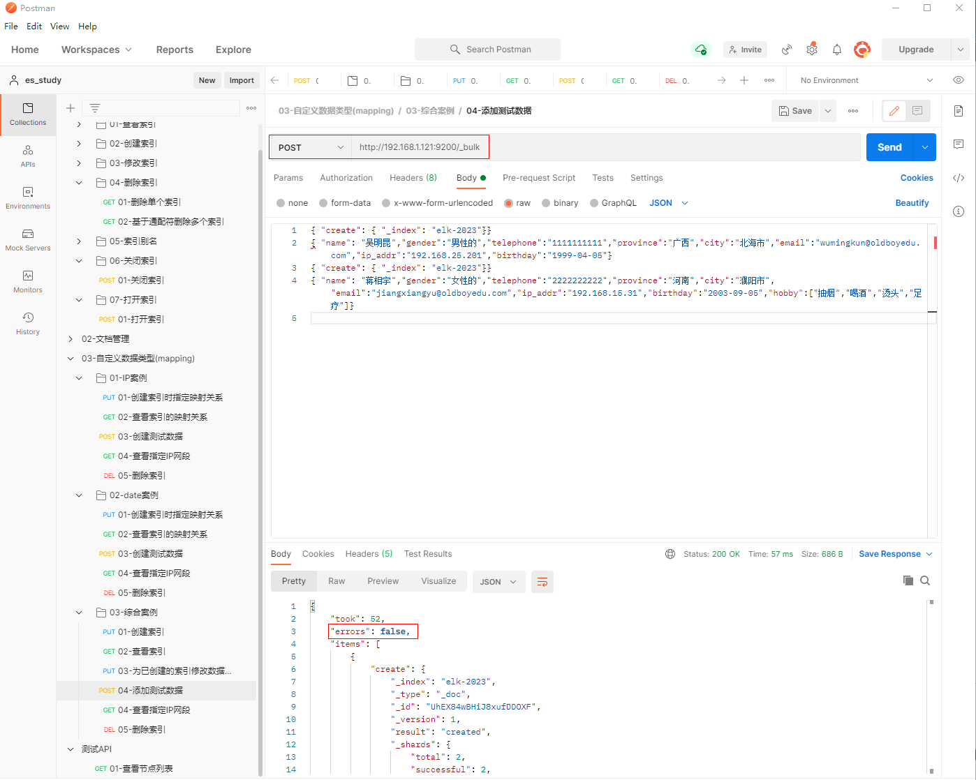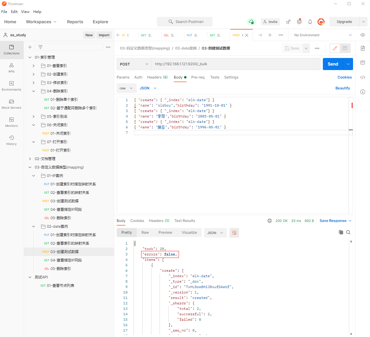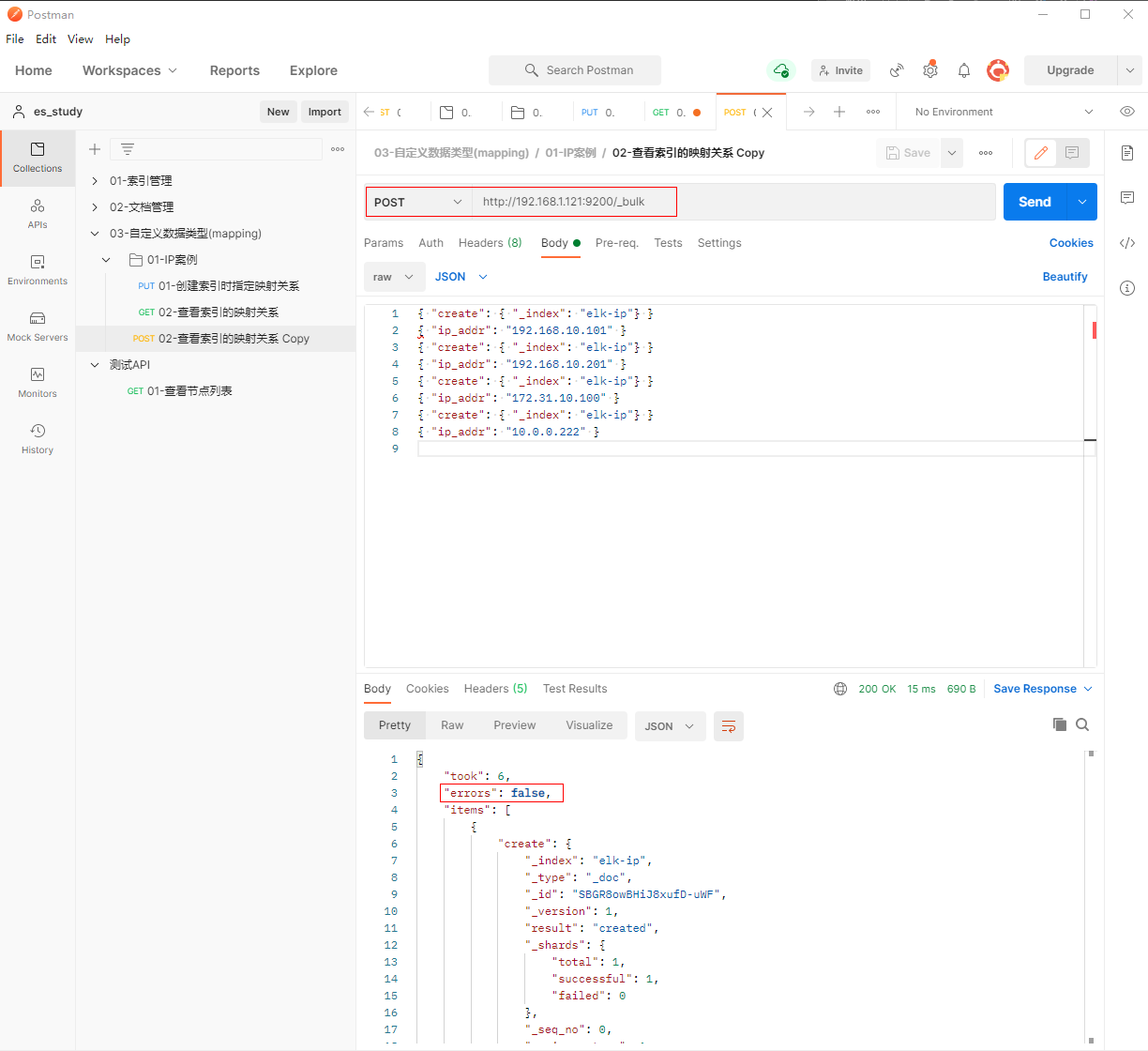 1、填写POST请求http://192.168.1.121:9200/_bulk, 创建索引时指定映射关系