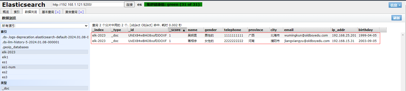 1、填写GET请求http://192.168.1.121:9200/elk-2023/_search, 精准匹配email的值为jiangxiangyu@oldboyedu.com,查看到成功匹配