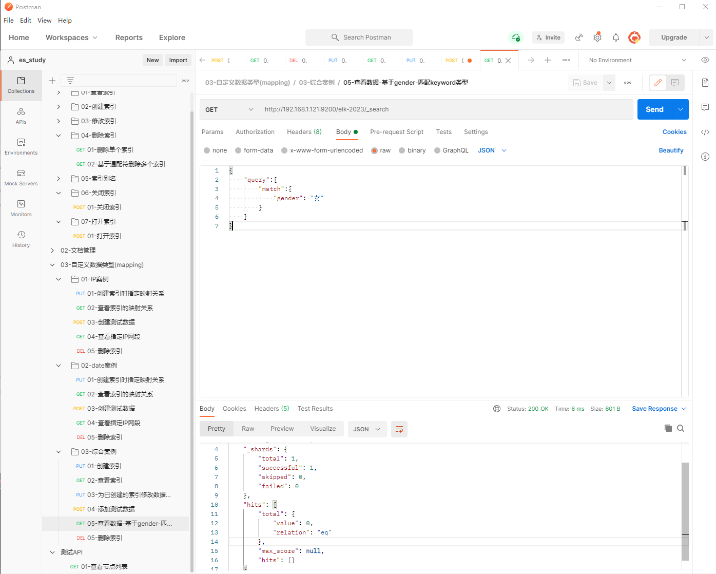 1、填写GET请求http://192.168.1.121:9200/elk-2023/_search, 匹配gender的值为女,查看到匹配结果为空