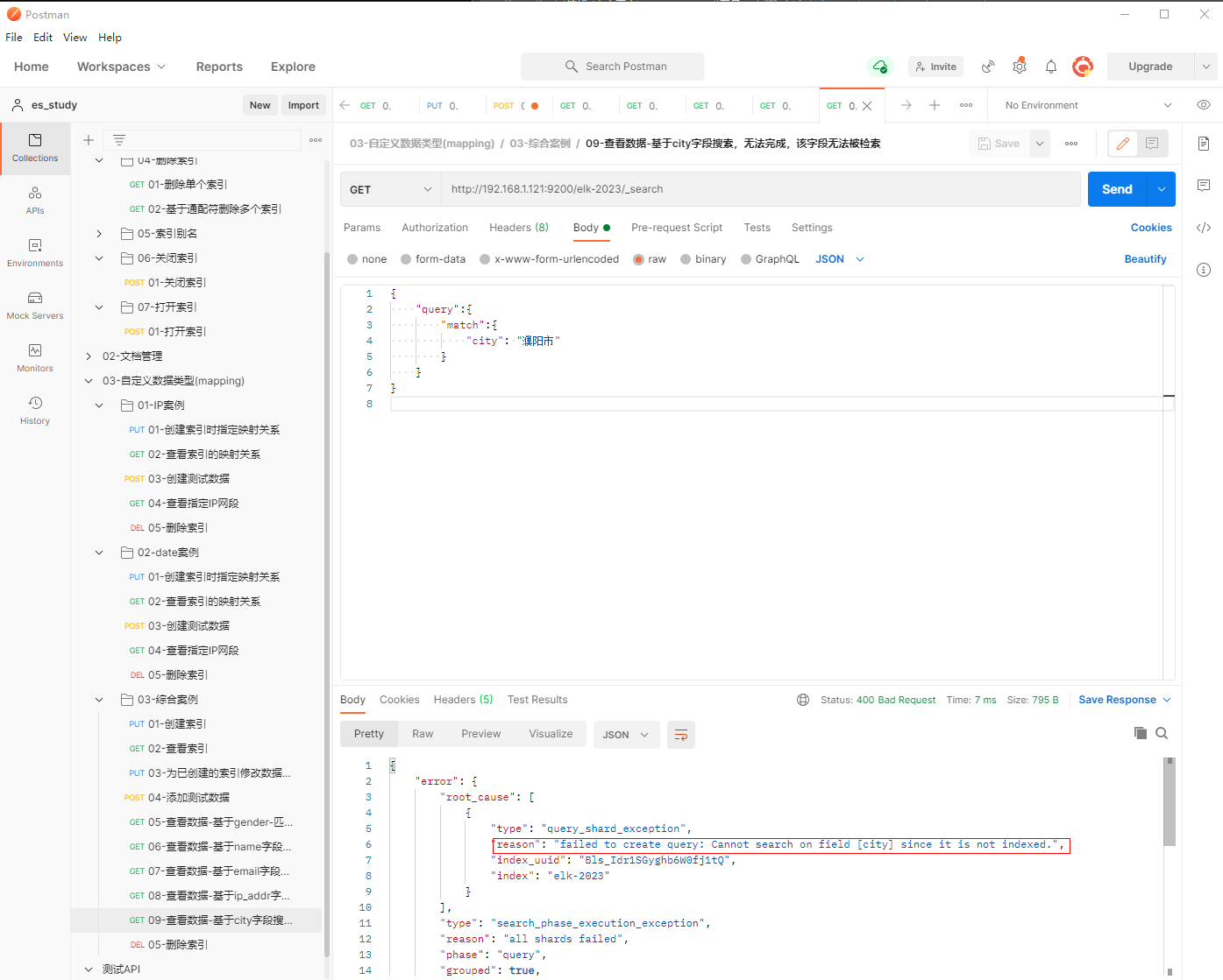1、填写GET请求http://192.168.1.121:9200/elk-2023/_search, 匹配city的值为濮阳市,查看到不能成功匹配