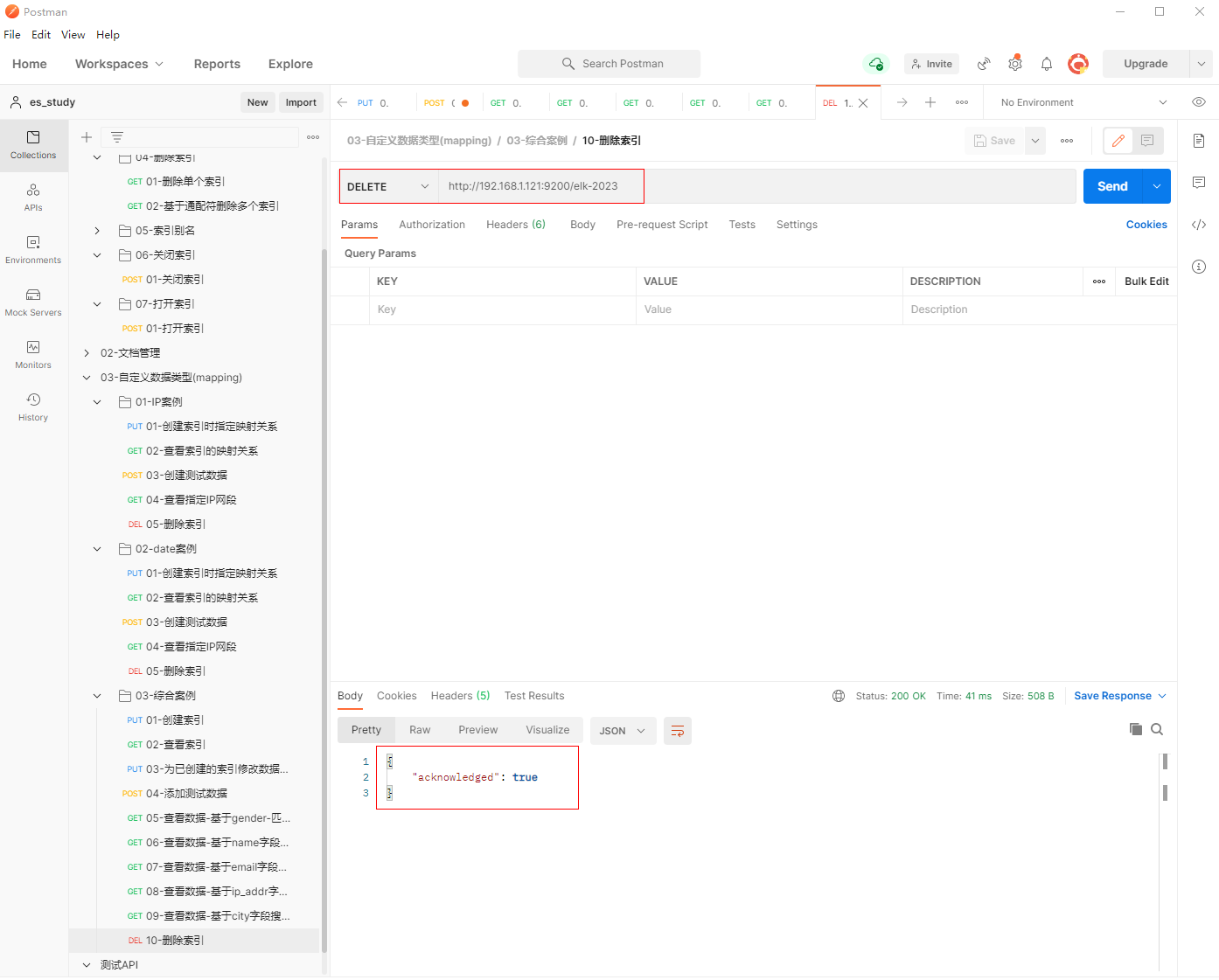 1、填写DELETE请求http://192.168.1.121:9200/elk-2023, 删除索引elk-2023