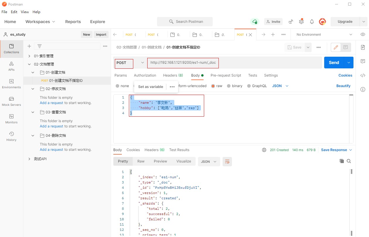 1、填写POST请求http://192.168.1.121:9200/es1-num/_doc,创建文档es1-num(不指定ID)