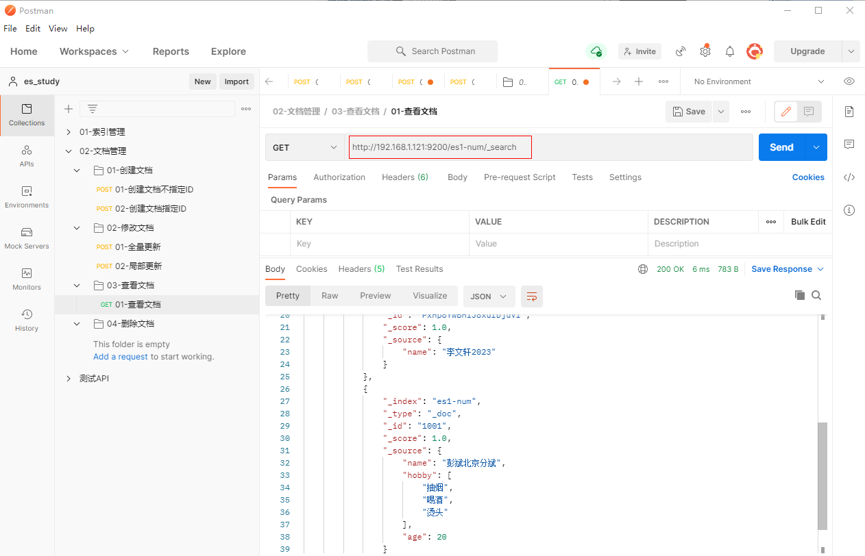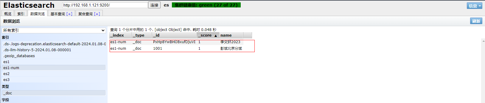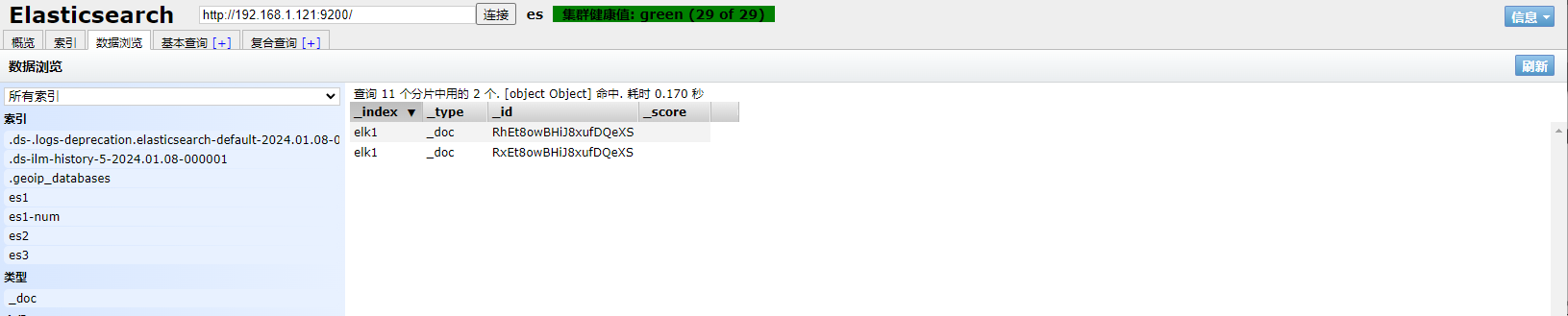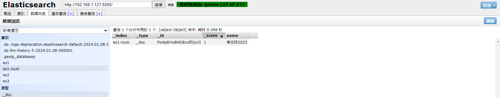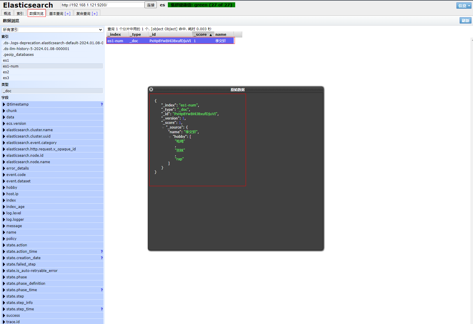 1、填写GET请求http://192.168.1.121:9200/es1-num/_search,查看文档