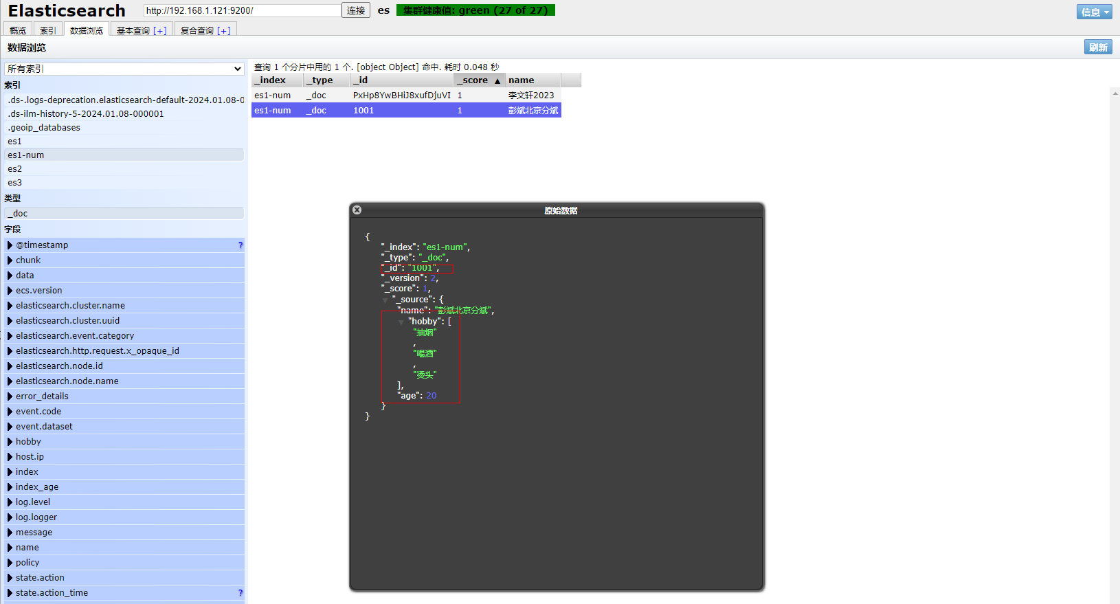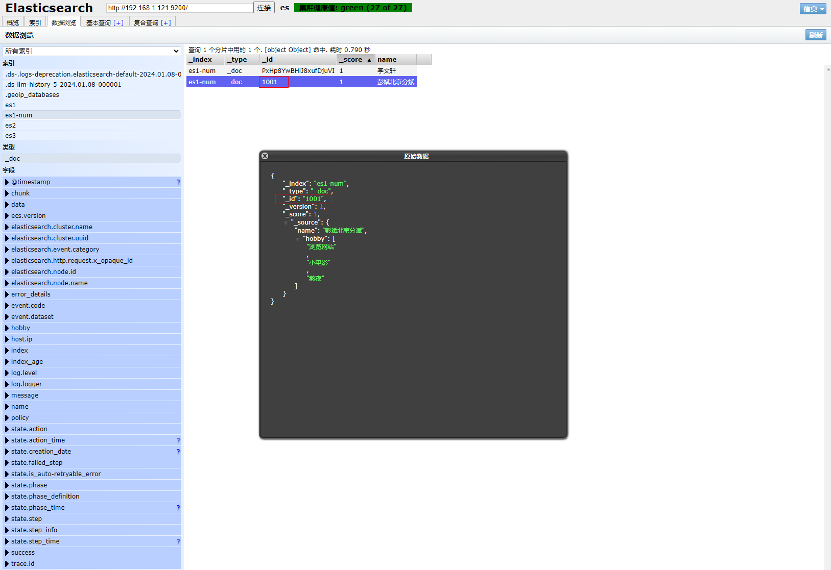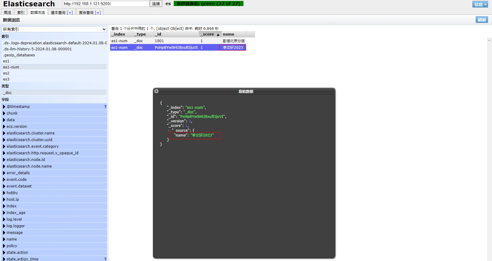 2、打开ES Head扩展程序查看文档具体信息,观察到只剩name字段