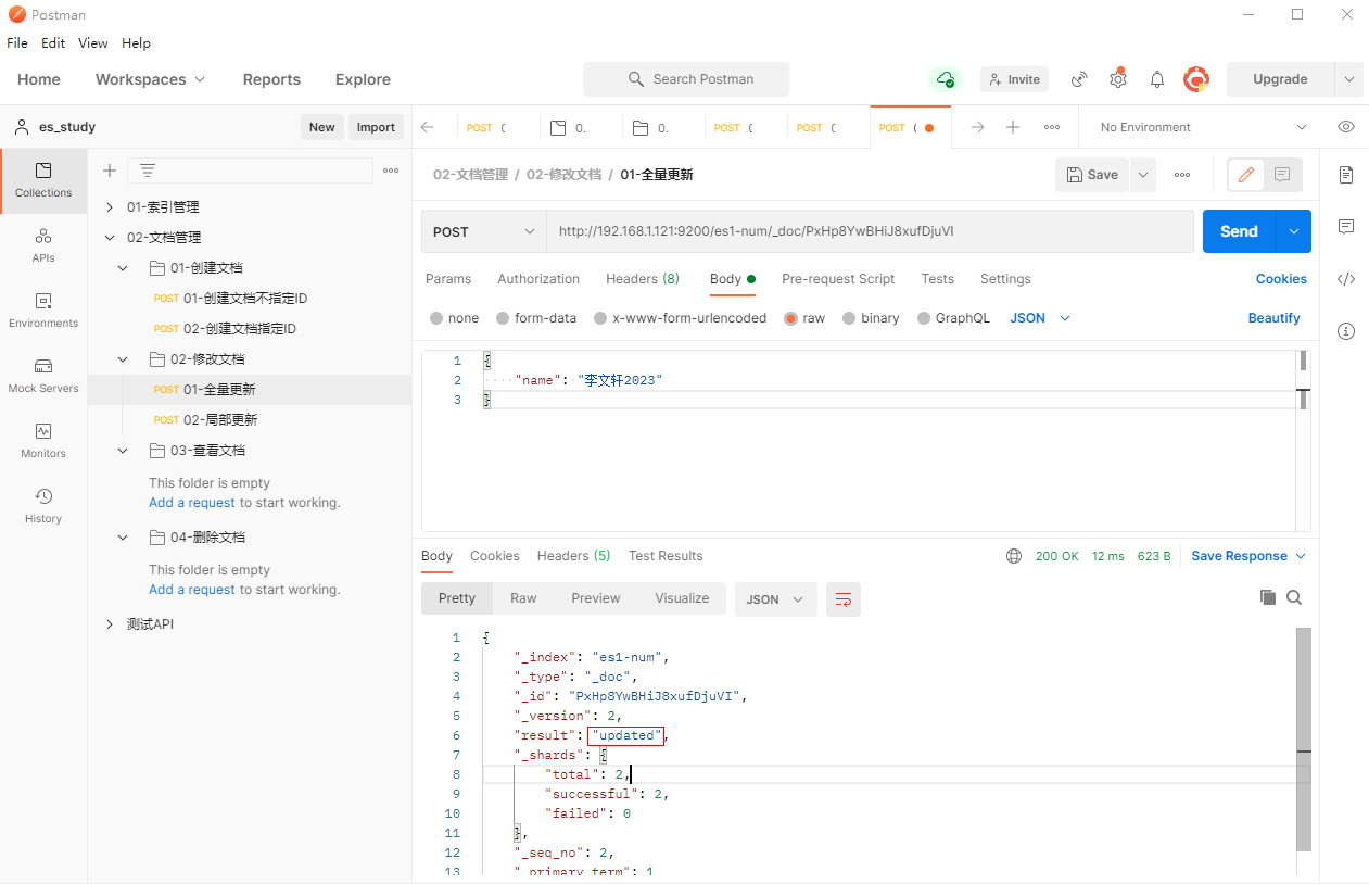 1、填写POST请求http://192.168.1.121:9200/es1-num/_doc/PxHp8YwBHiJ8xufDjuVI,全量更新(所见即所得)