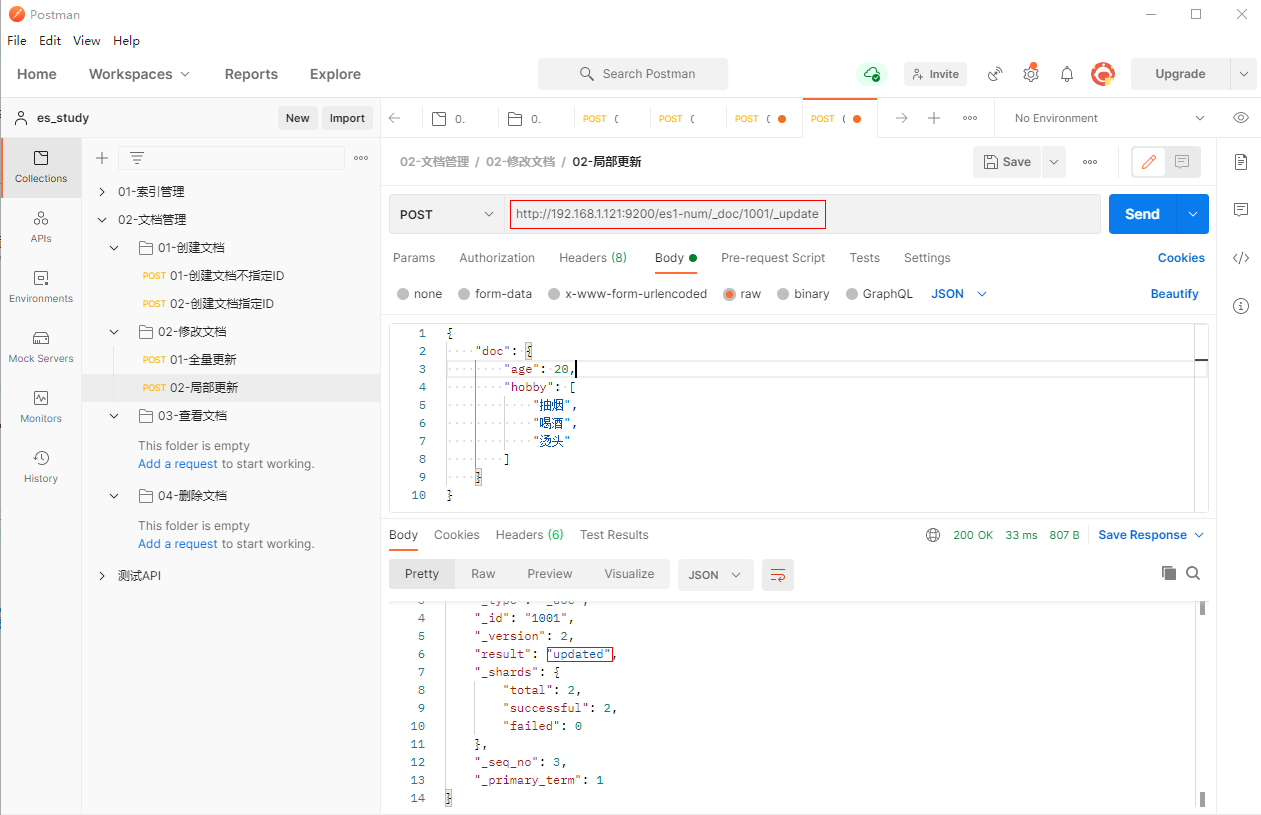 1、填写POST请求http://192.168.1.121:9200/es1-num/_doc/1001/_update,局部更新文档