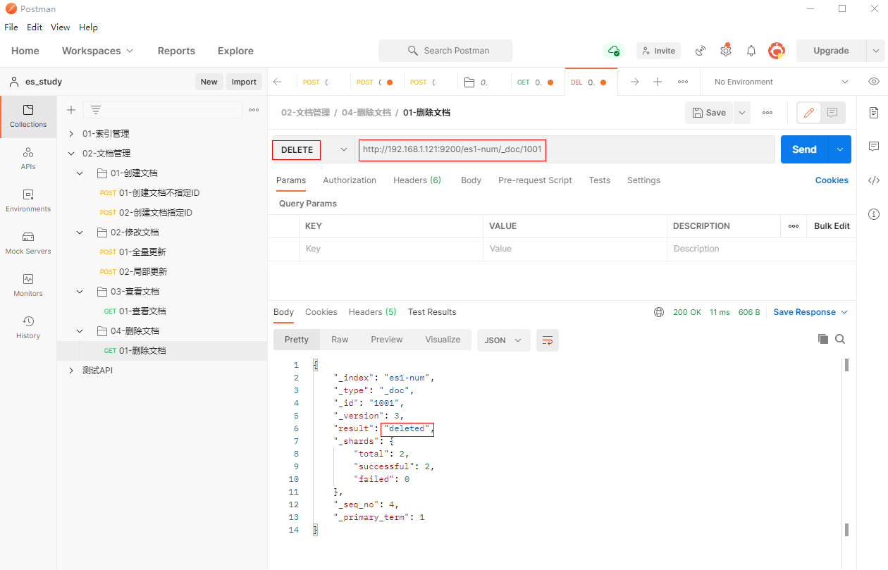 1、填写DELETE请求http://192.168.1.121:9200/es1-num/_doc/1001,删除文档