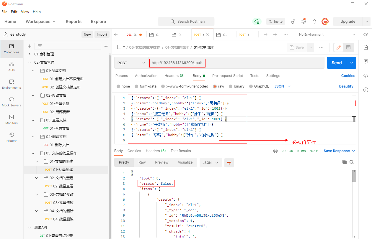 1、填写POST请求http://192.168.1.121:9200/_bulk,批量创建文档