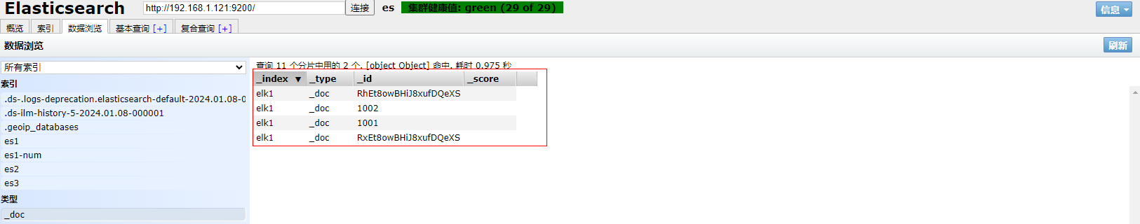 2、打开ES Head扩展程序查看文档,ID为1001的文档已被删除