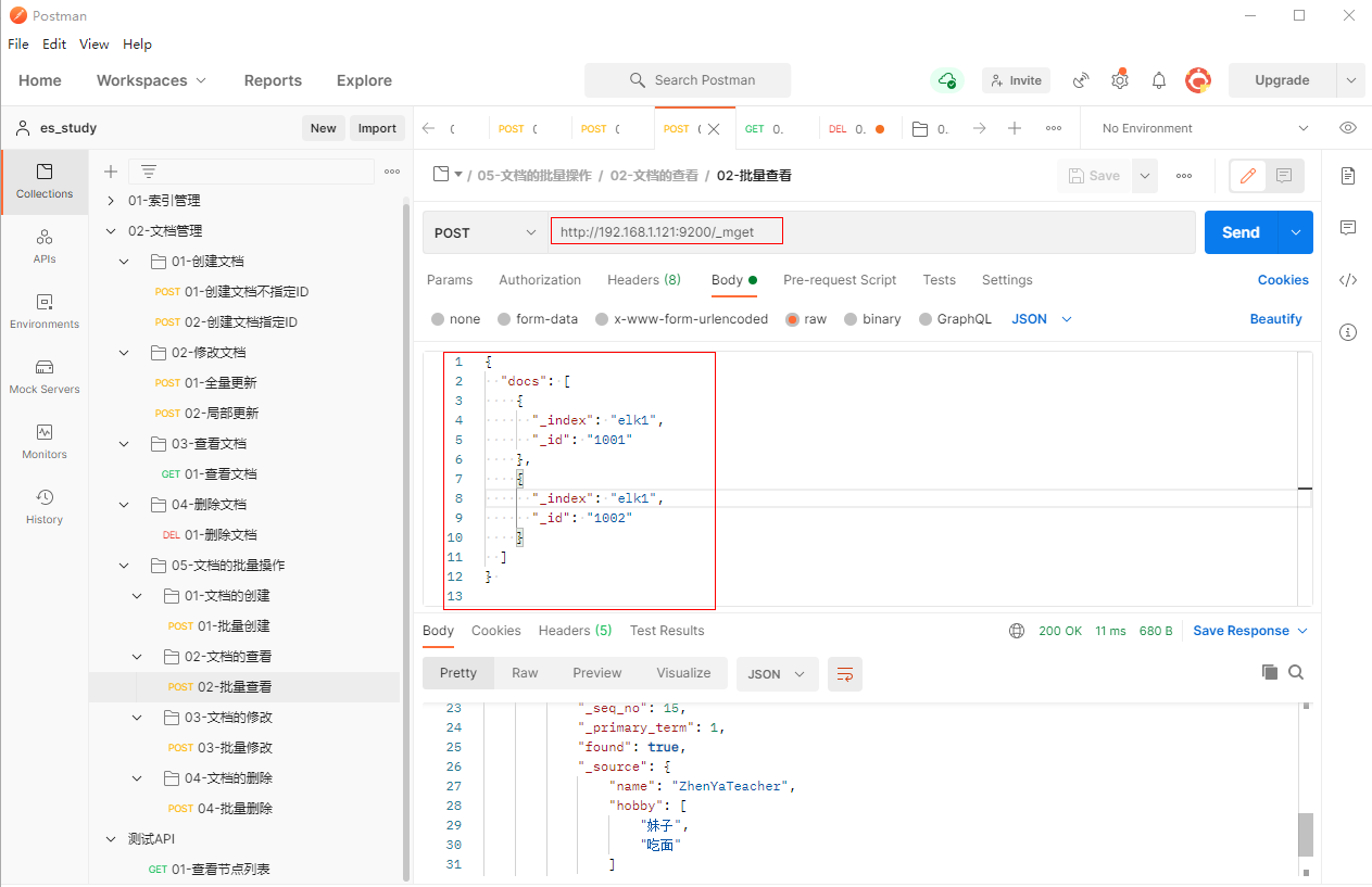1、填写POST请求http://192.168.1.121:9200/_mget,批量查看id分别为1001和1002的文档
