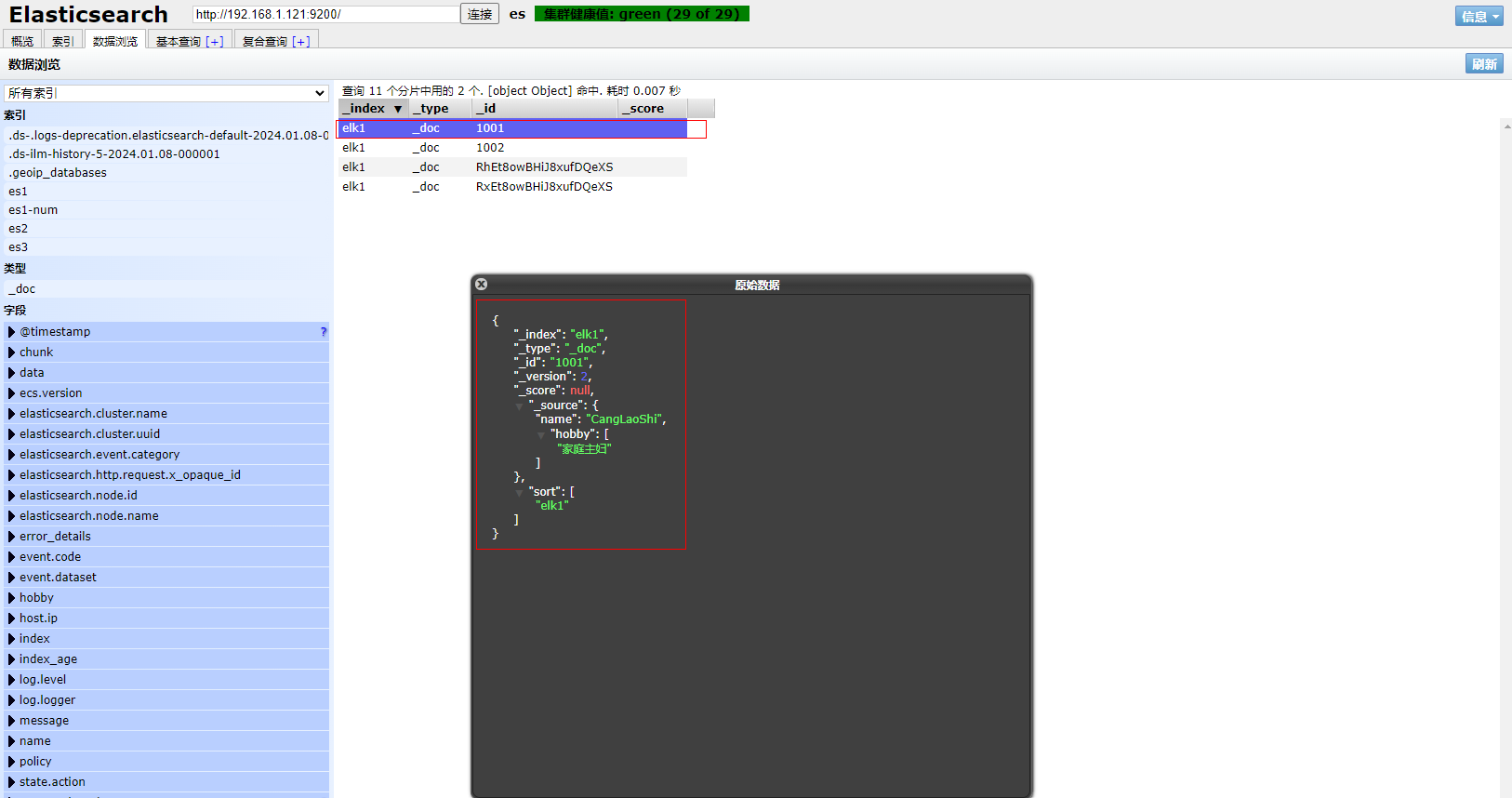 2、也可以打开ES Head扩展程序查看文档具体信息