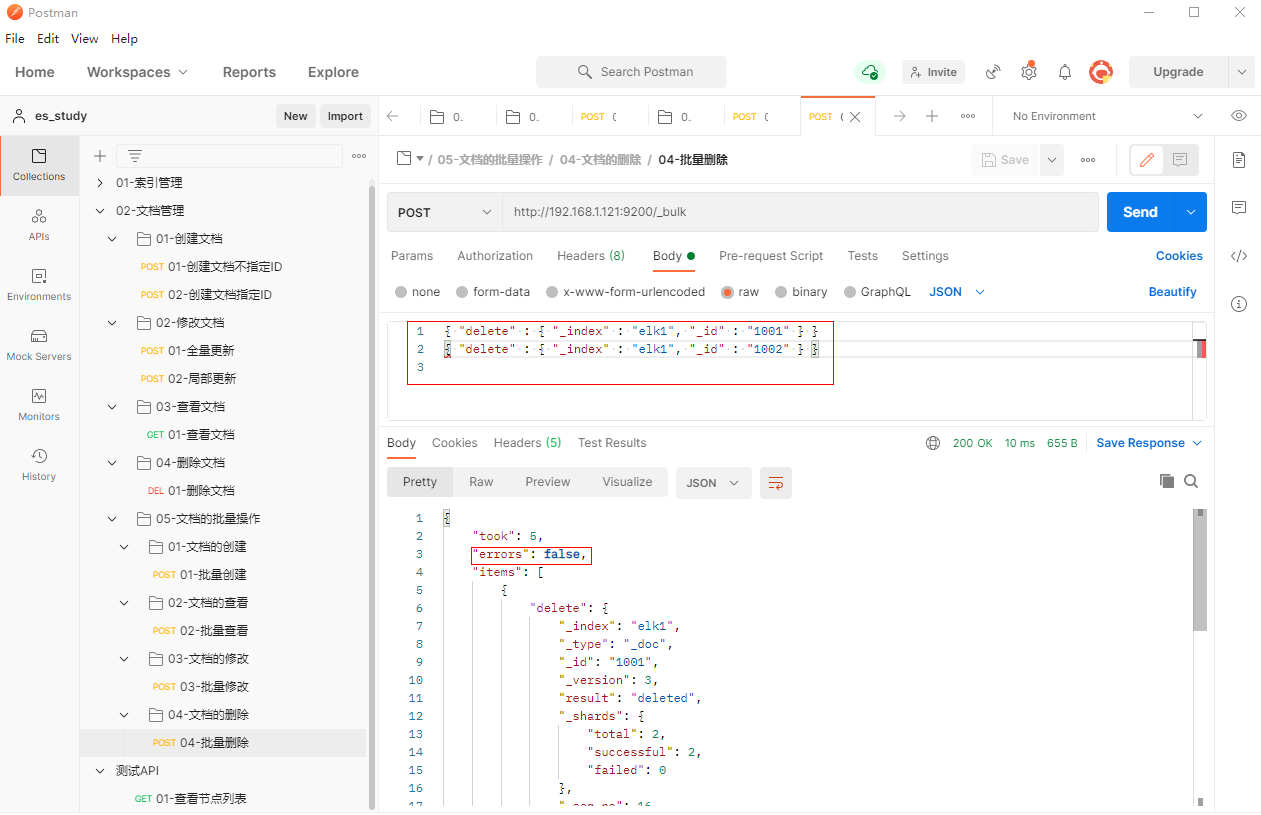 1、填写POST请求http://192.168.1.121:9200/_bulk,删除id分别为1001和1002的文档