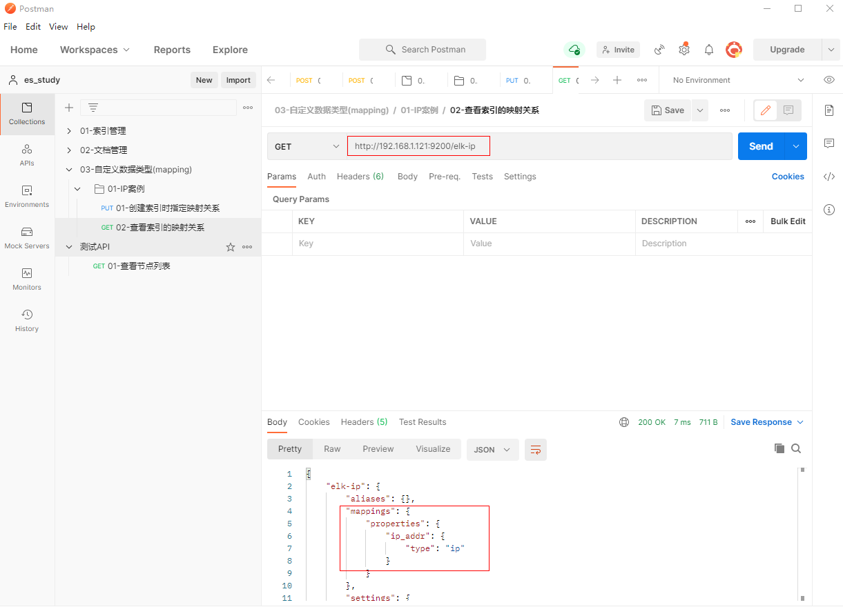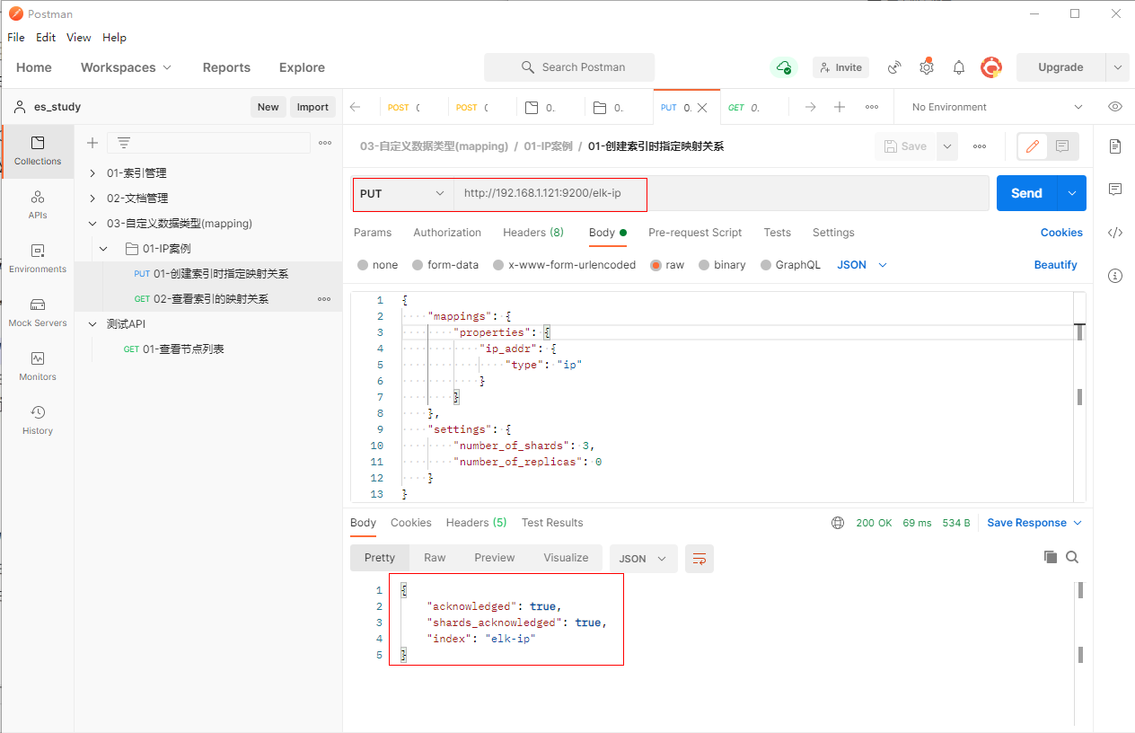 1、填写PUT请求http://192.168.1.121:9200/elk-ip, 创建索引时指定映射关系