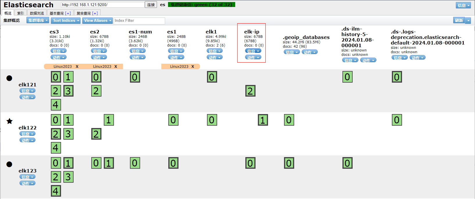 2、打开ES Head扩展程序查看索引elk-ip已经被删除