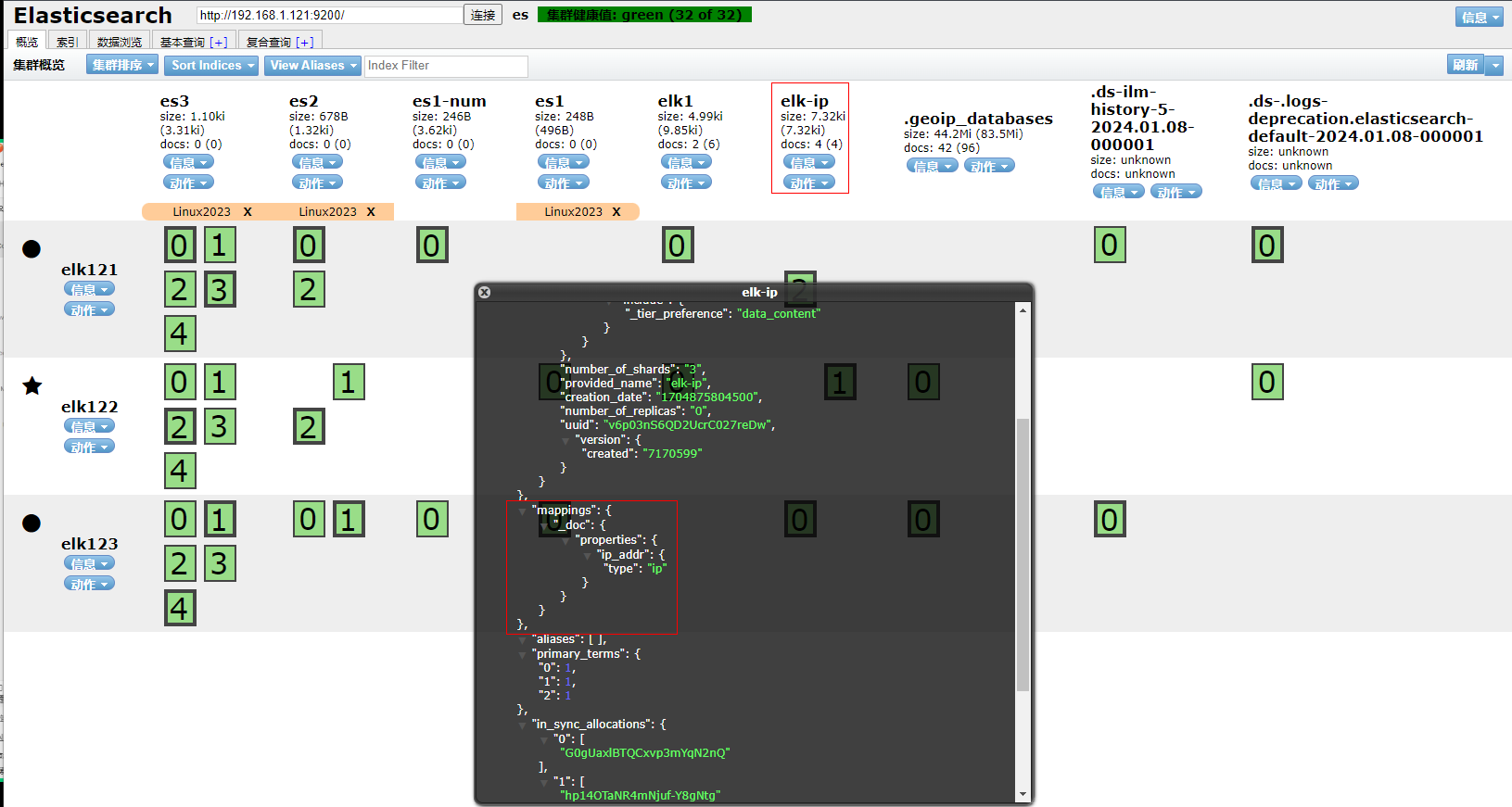 1、填写GET请求http://192.168.1.121:9200/elk-ip, 查看索引的映射关系