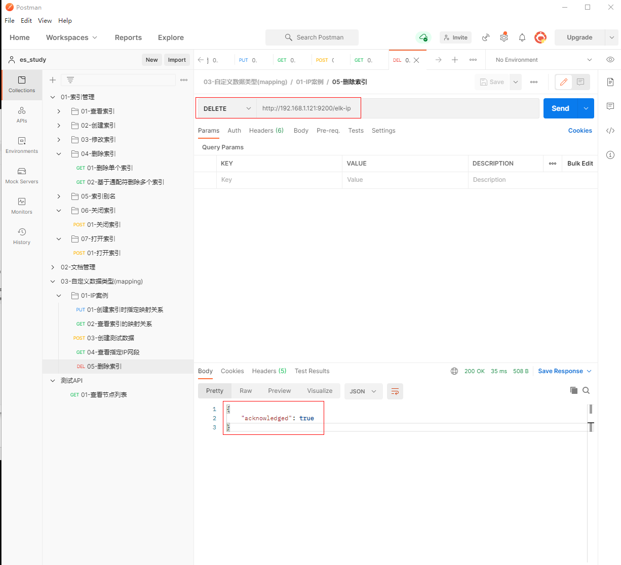 1、填写DELETE请求http://192.168.1.121:9200/elk-ip, 删除索引elk-ip
