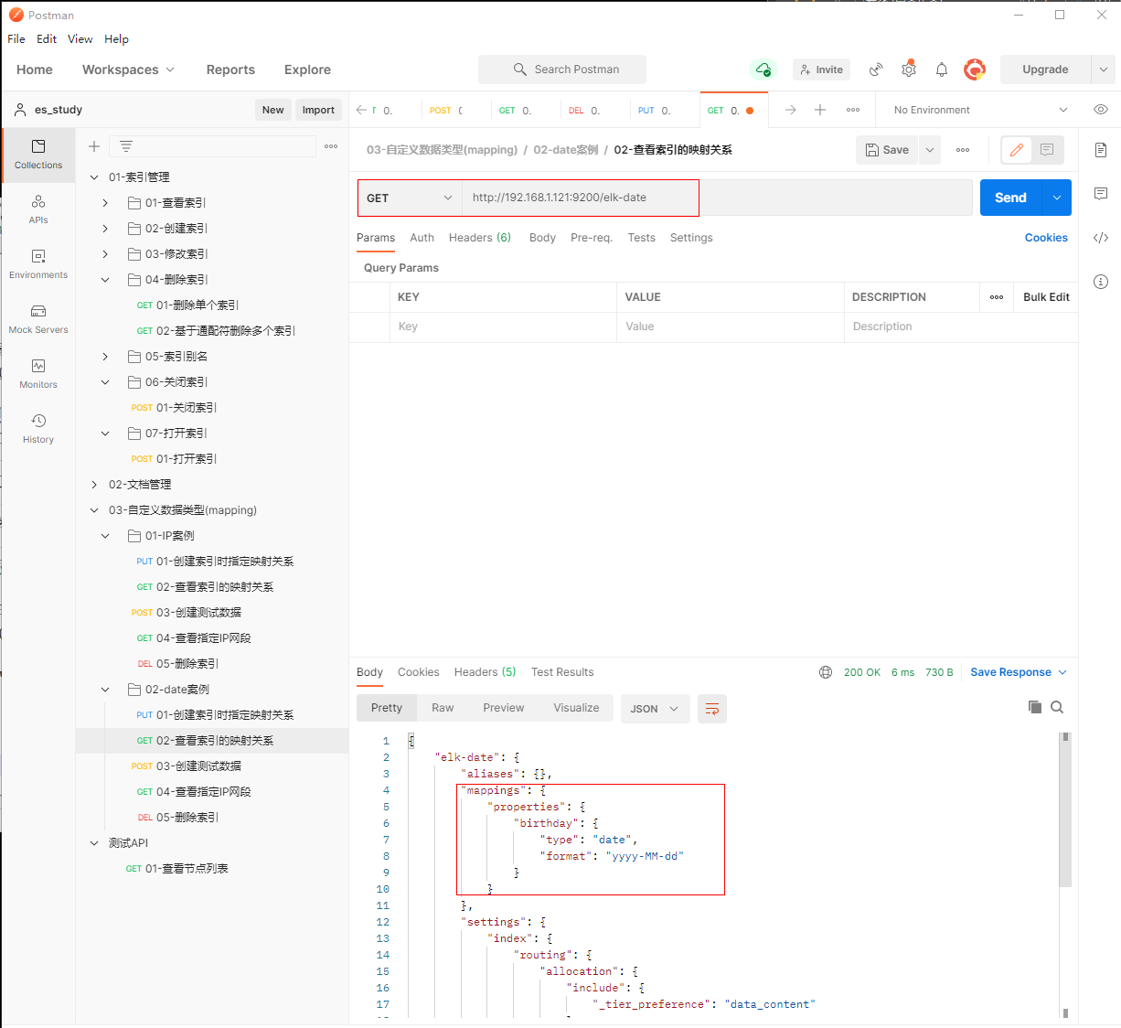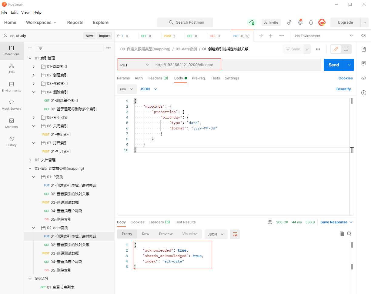 1、填写PUT请求http://192.168.1.121:9200/elk-date, 创建索引时指定映射关系