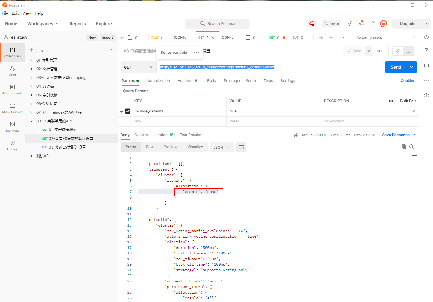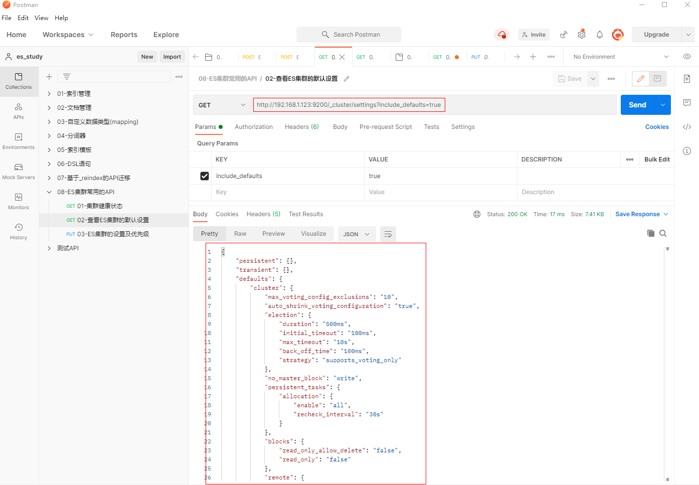 填写GET请求http://192.168.1.123:9200/_cluster/settings?include_defaults=true,查看ES集群的默认设置