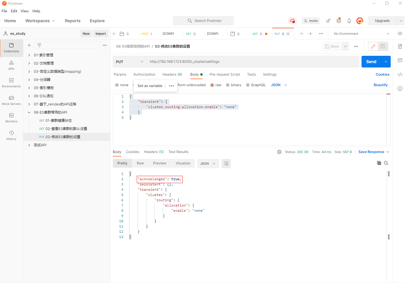 1、填写PUT请求http://192.168.1.123:9200/_cluster/settings,修改ES集群的设置为不允许分配任何类型的分配
