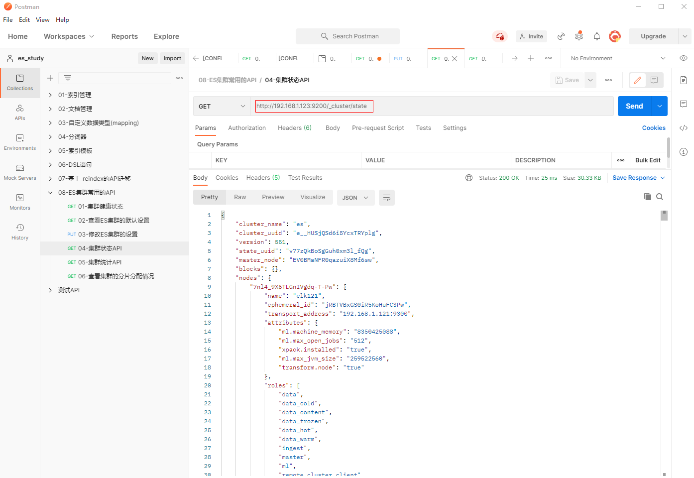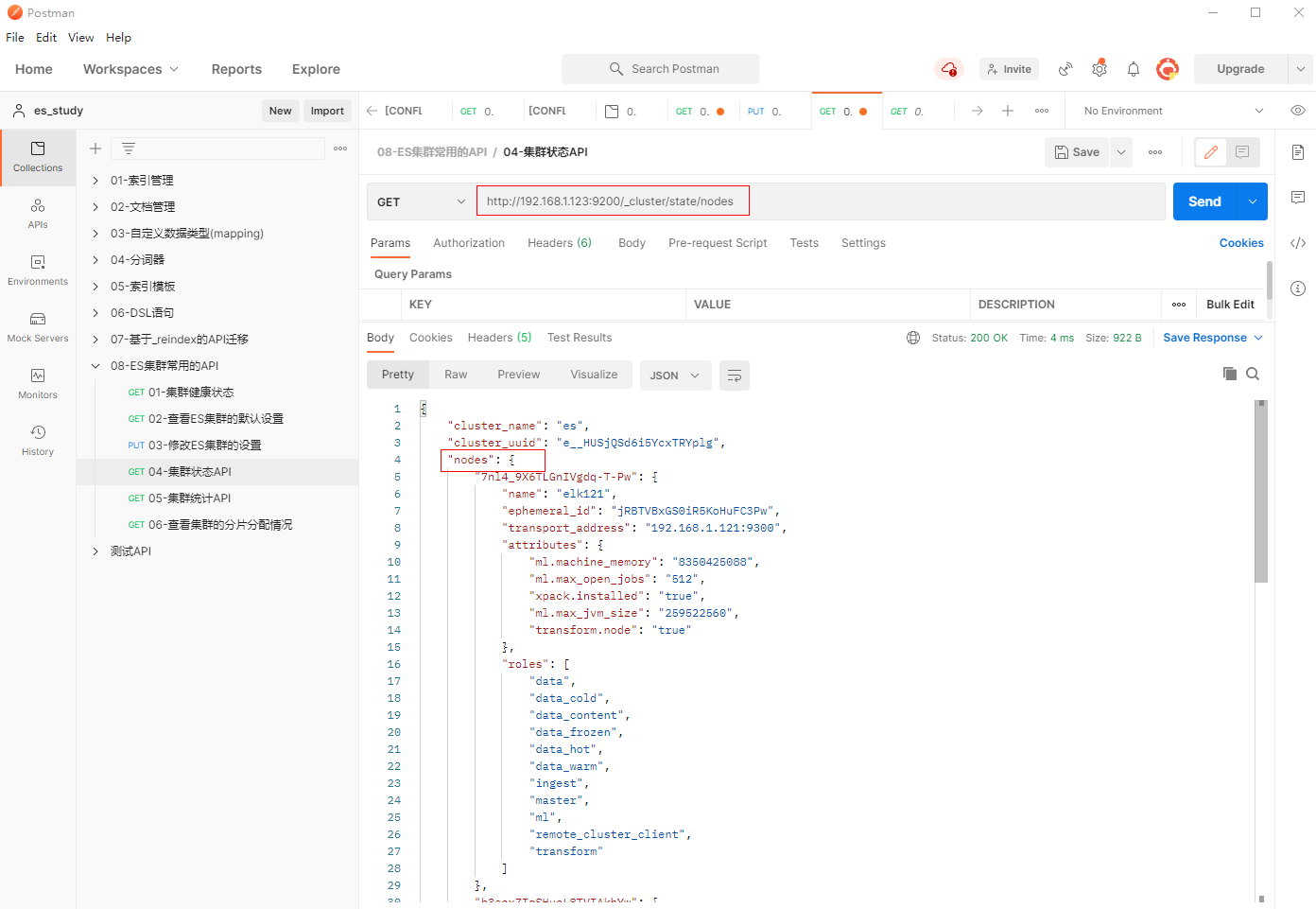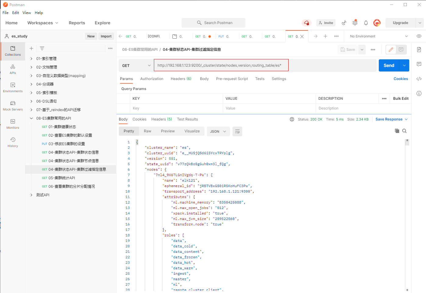 1、填写GET请求http://192.168.1.123:9200/_cluster/state/nodes,version,routing_table/es*, 查看集群的节点信息