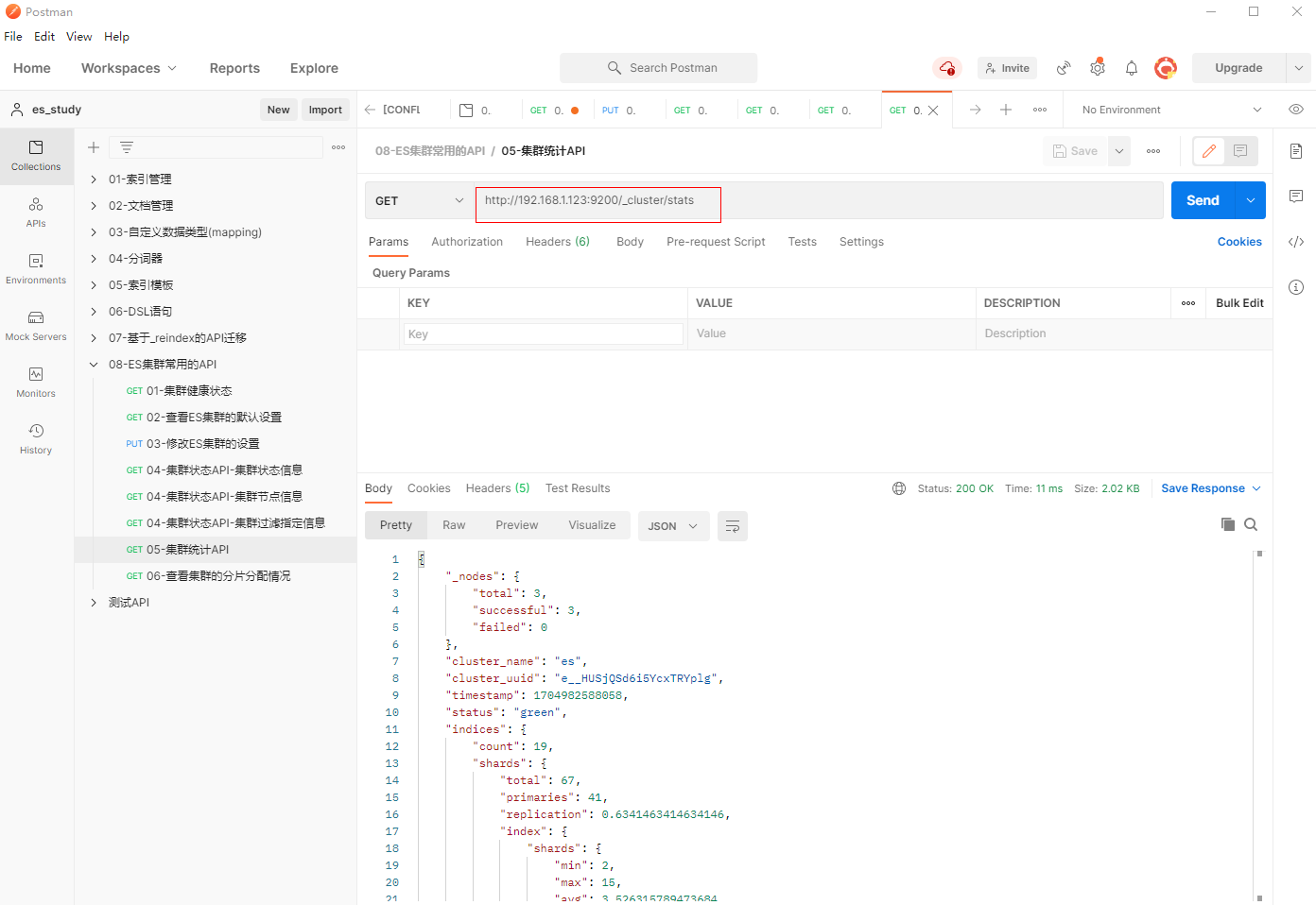 填写GET请求http://192.168.1.123:9200/_cluster/stats, 查看集群的统计信息