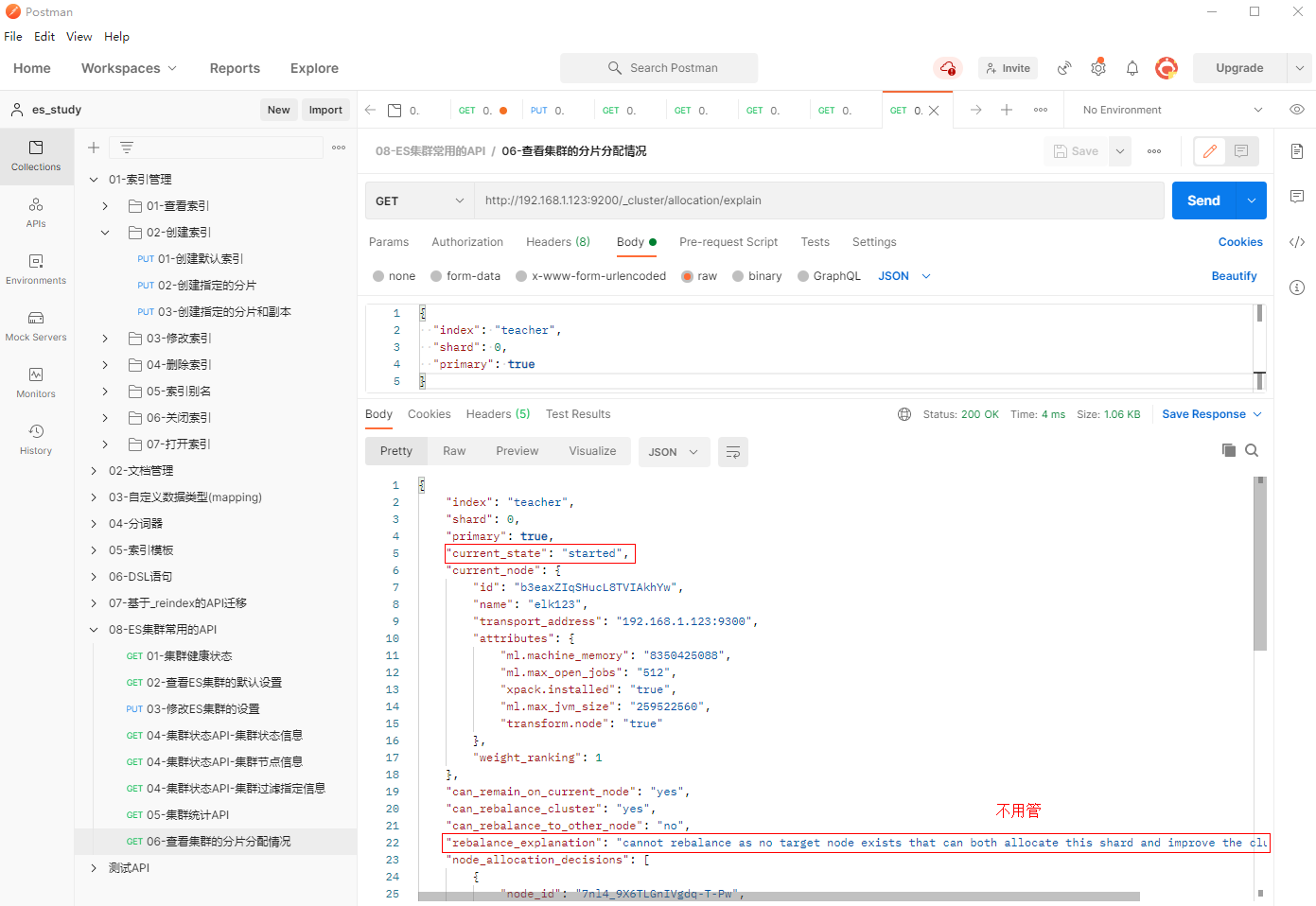 填写GET请求http://192.168.1.123:9200/_cluster/allocation/explain, 查看集群分片分配的情况