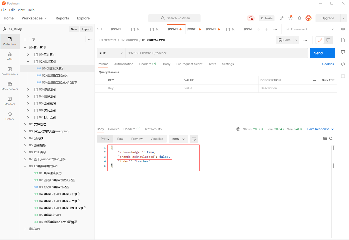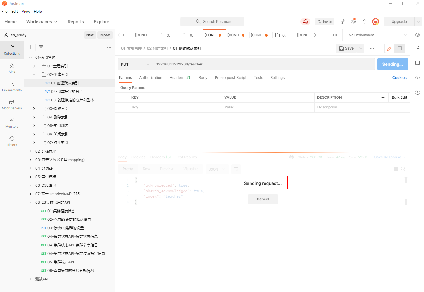 3、填写PUT请求192.168.1.121:9200/teacher, 创建索引teacher。观察到一直处于请求中