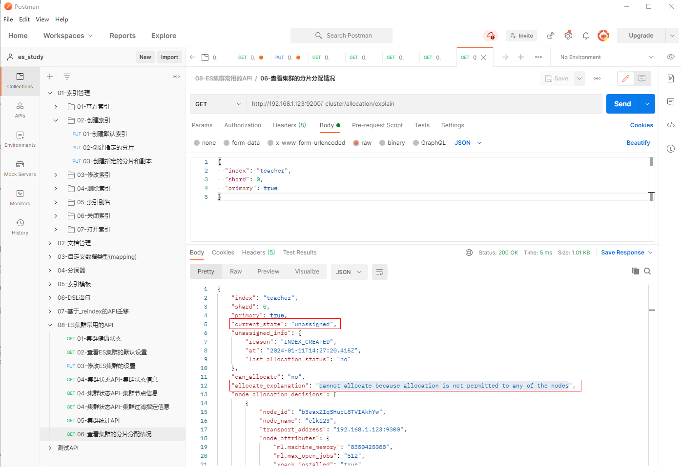 4、填写GET请求http://192.168.1.123:9200/_cluster/allocation/explain, 分析teacher索引的0号分片未分配的原因。观察到显示无法分配,因为任何节点都不允许分配
