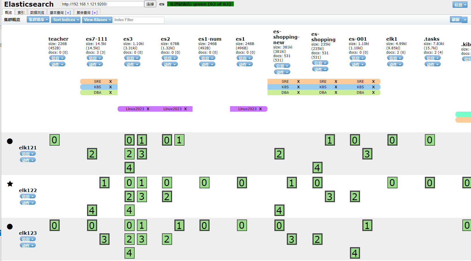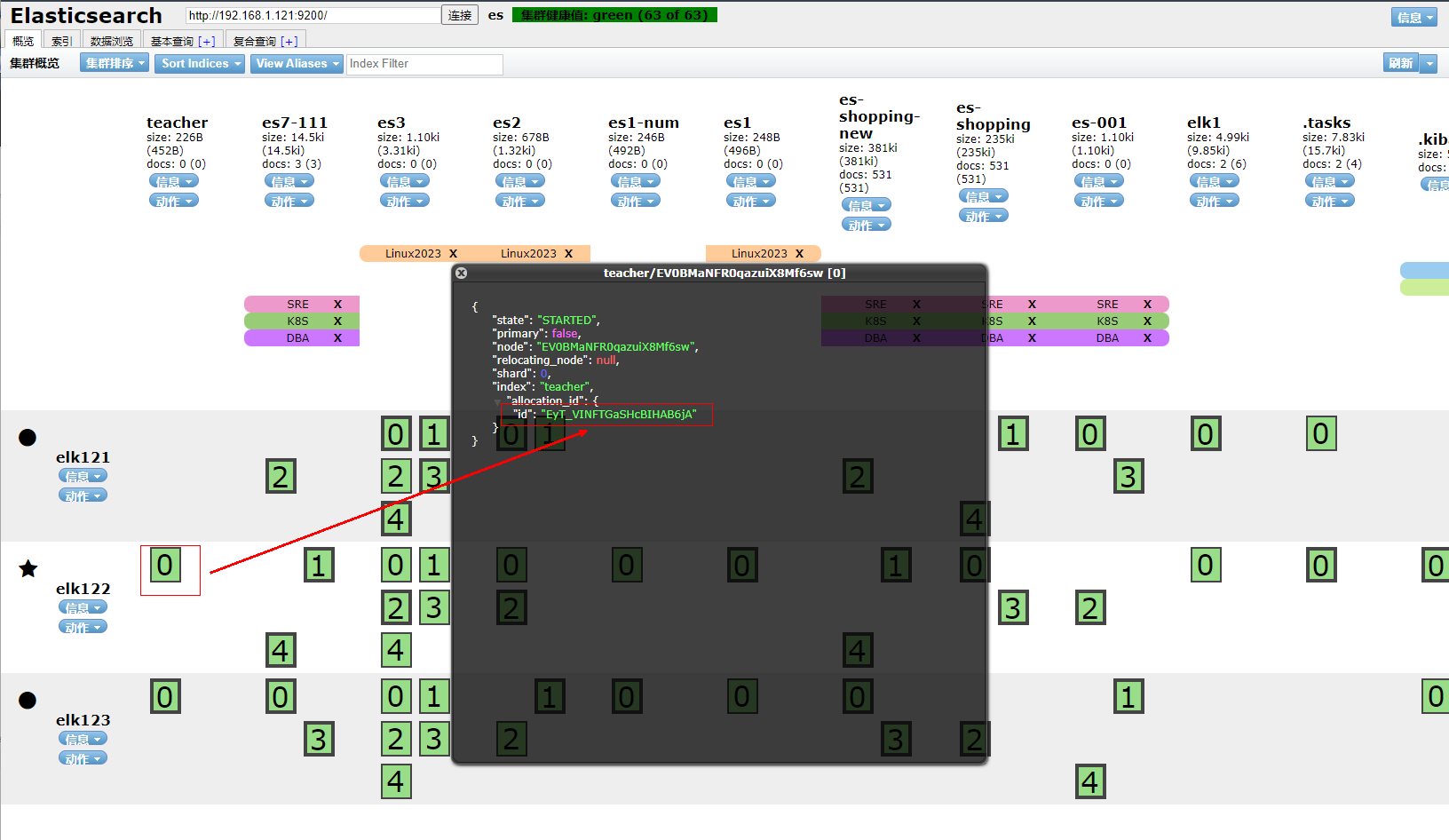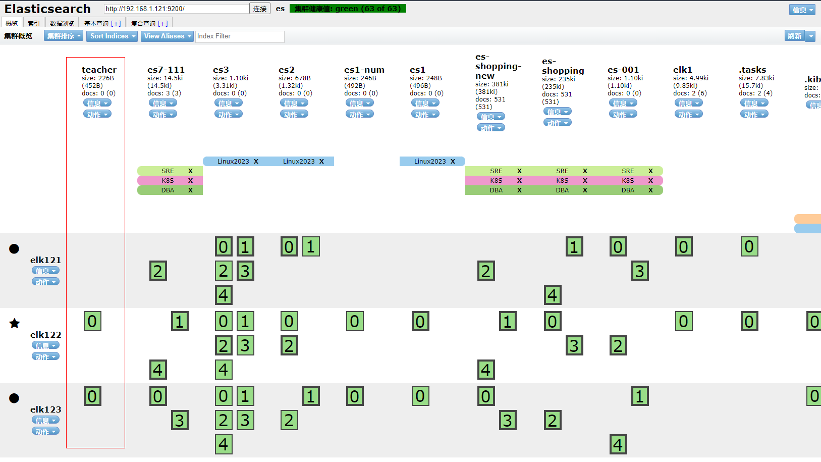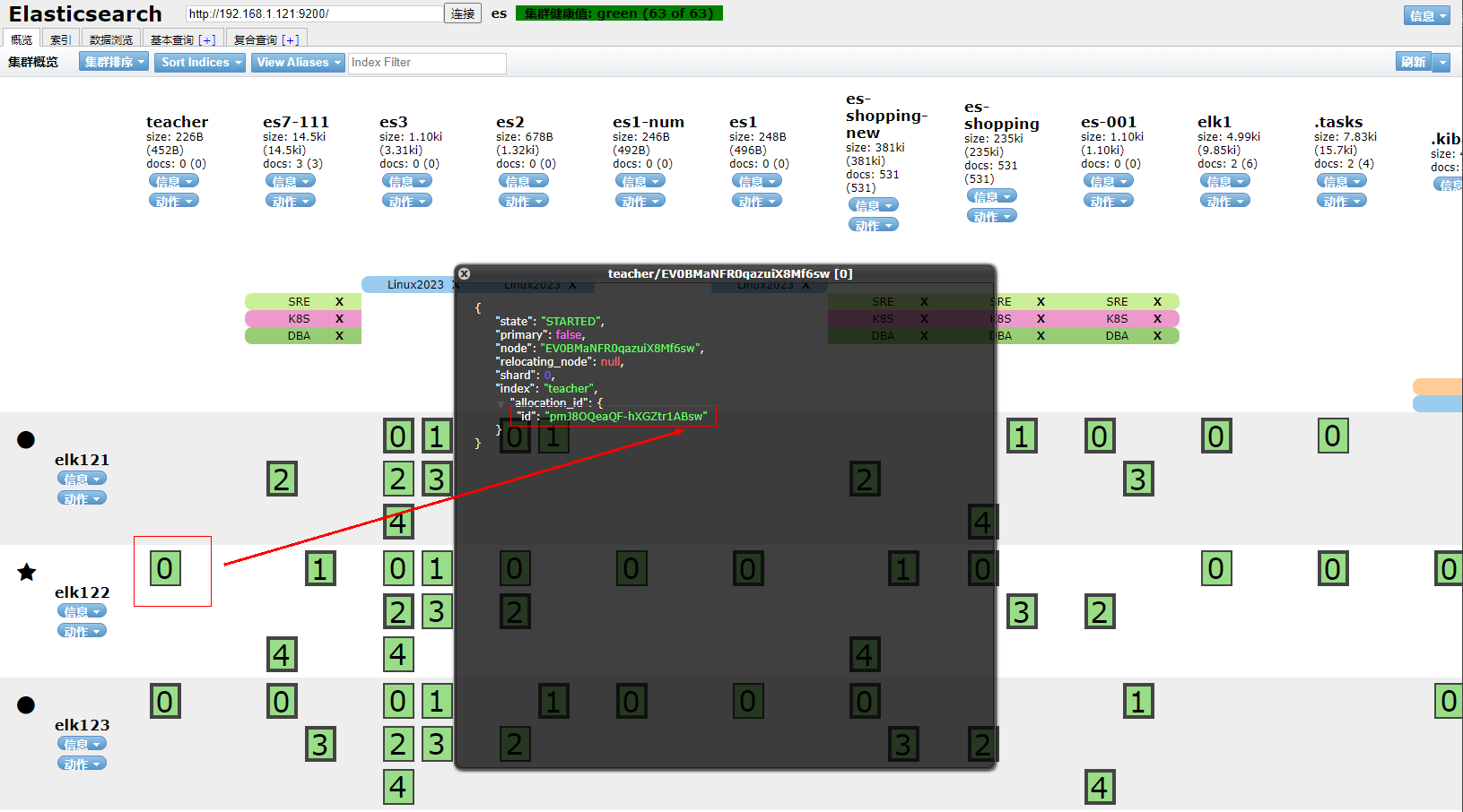 将”teacher” 索引的0号分片从elk121节点移动到elk122节点。下图是原本环境: