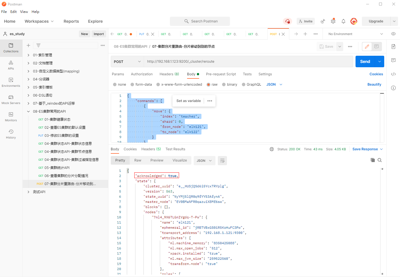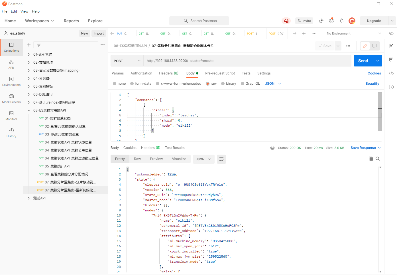 1、填写POST请求http://192.168.1.123:9200/_cluster/reroute, 将elk122节点的”teacher” 索引的0号副本分片进行初始化分配