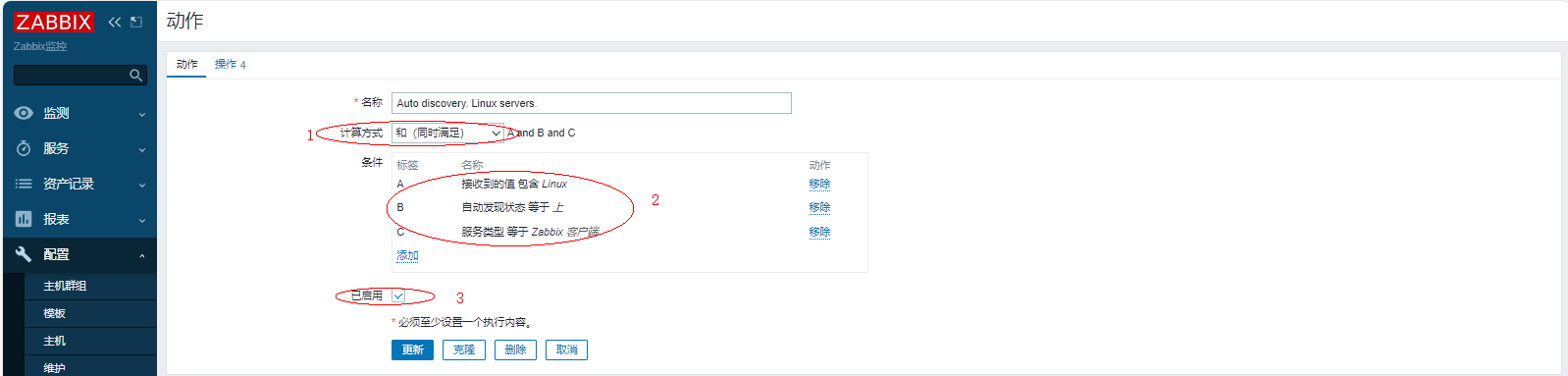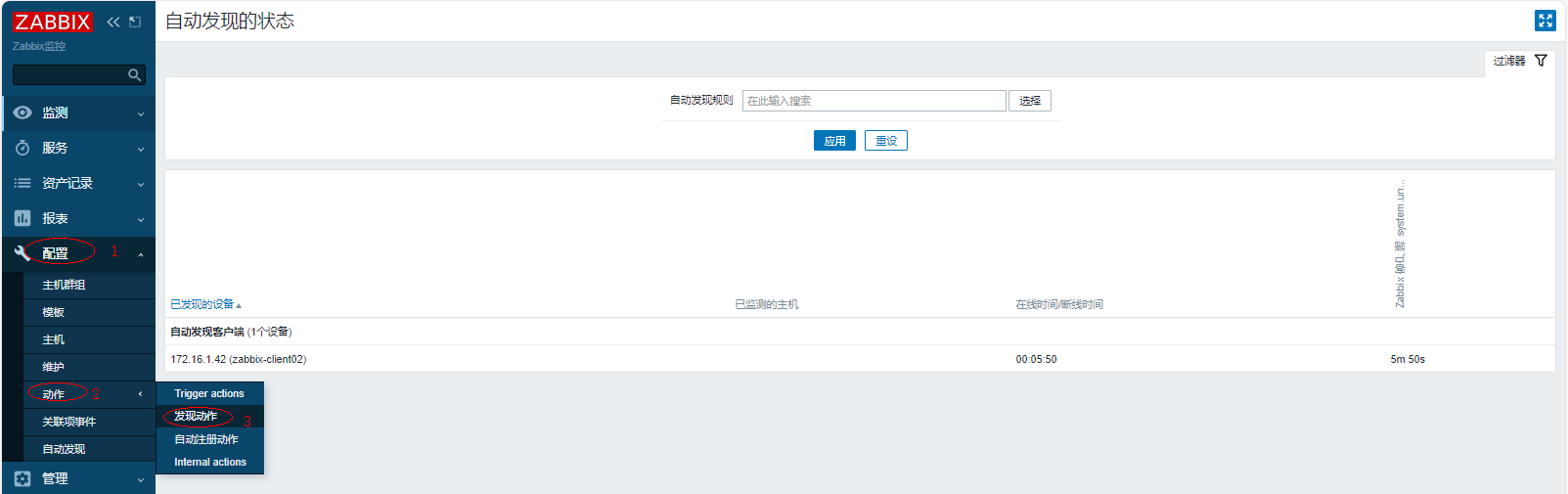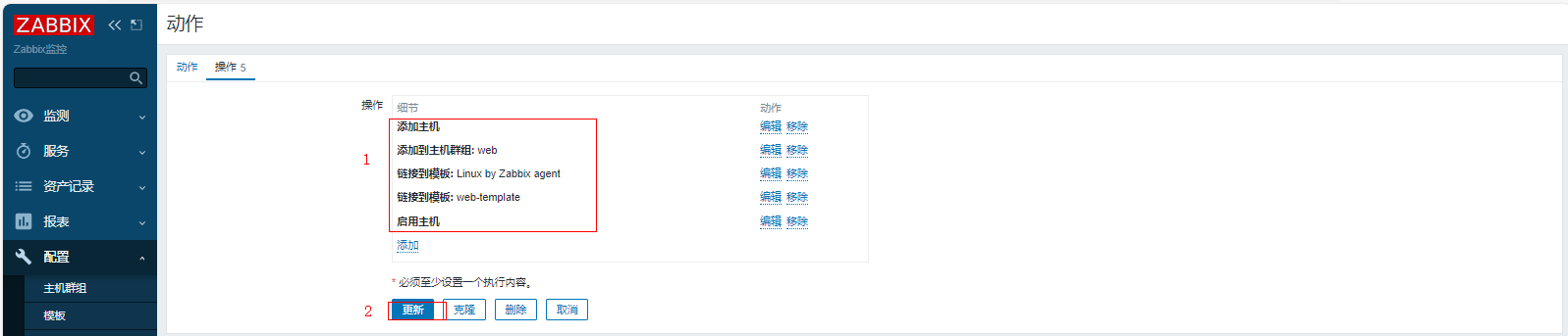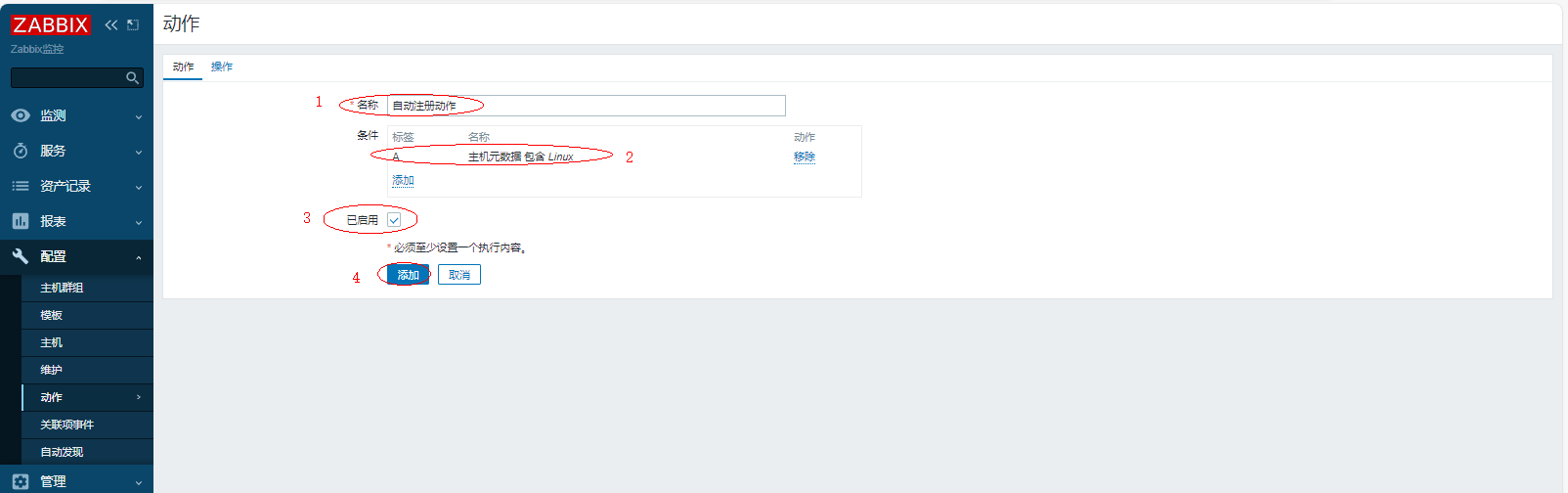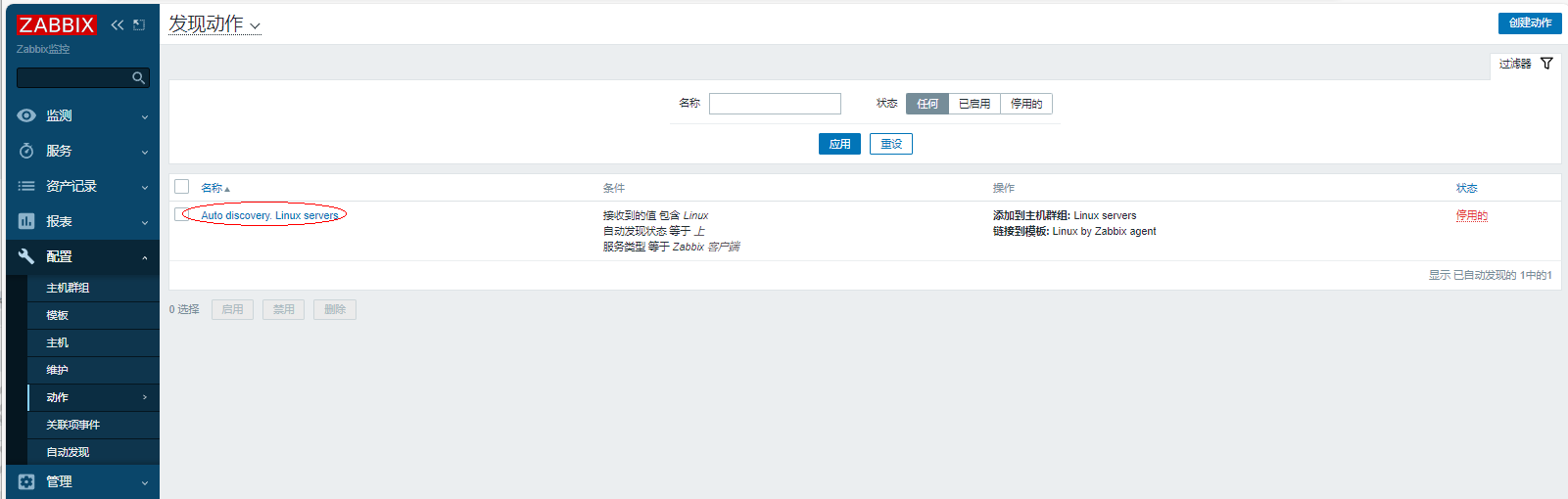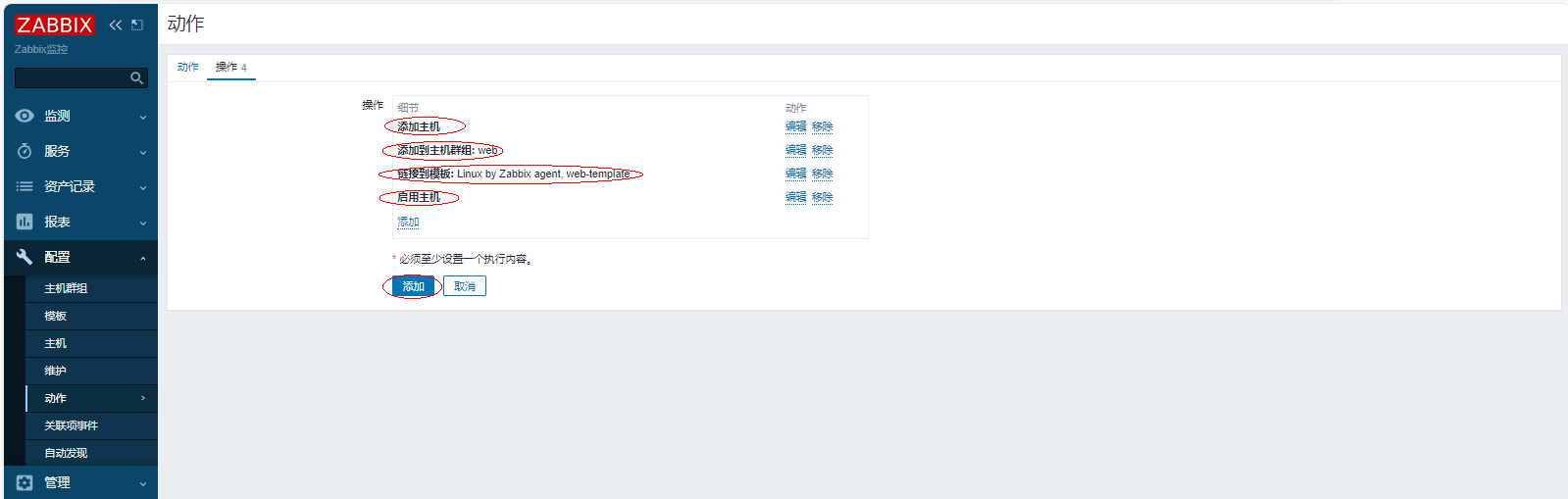 3、web界面配置自动发现的动作,用于将发现的主机关联模板,添加主机,加入主机组,启用