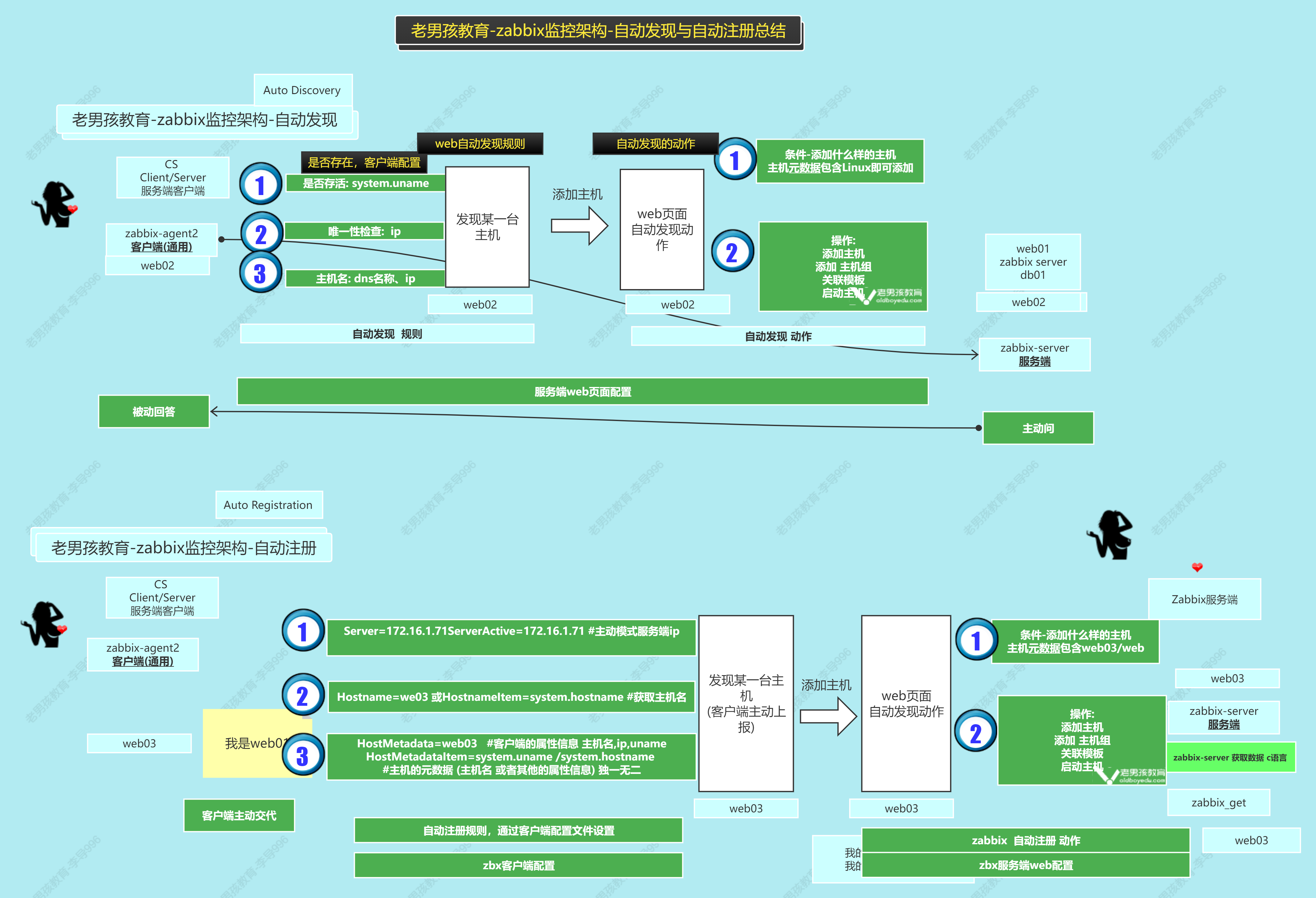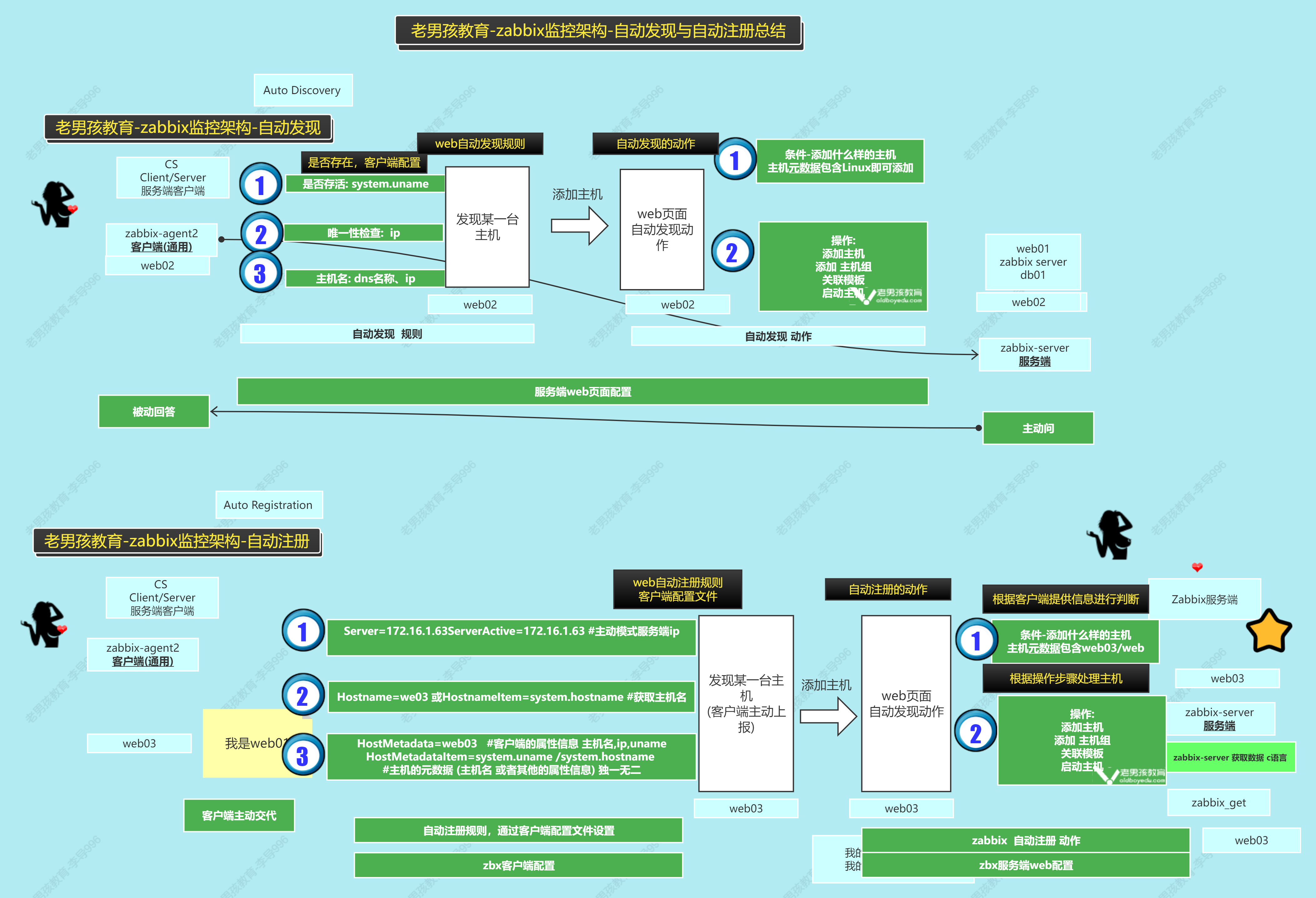 | 自动发现(客户端主动) | Zbx客户端主动去找服务端提交自己的信息,请求向服务端注册 | 配置繁琐,经常性。大量主机。 |